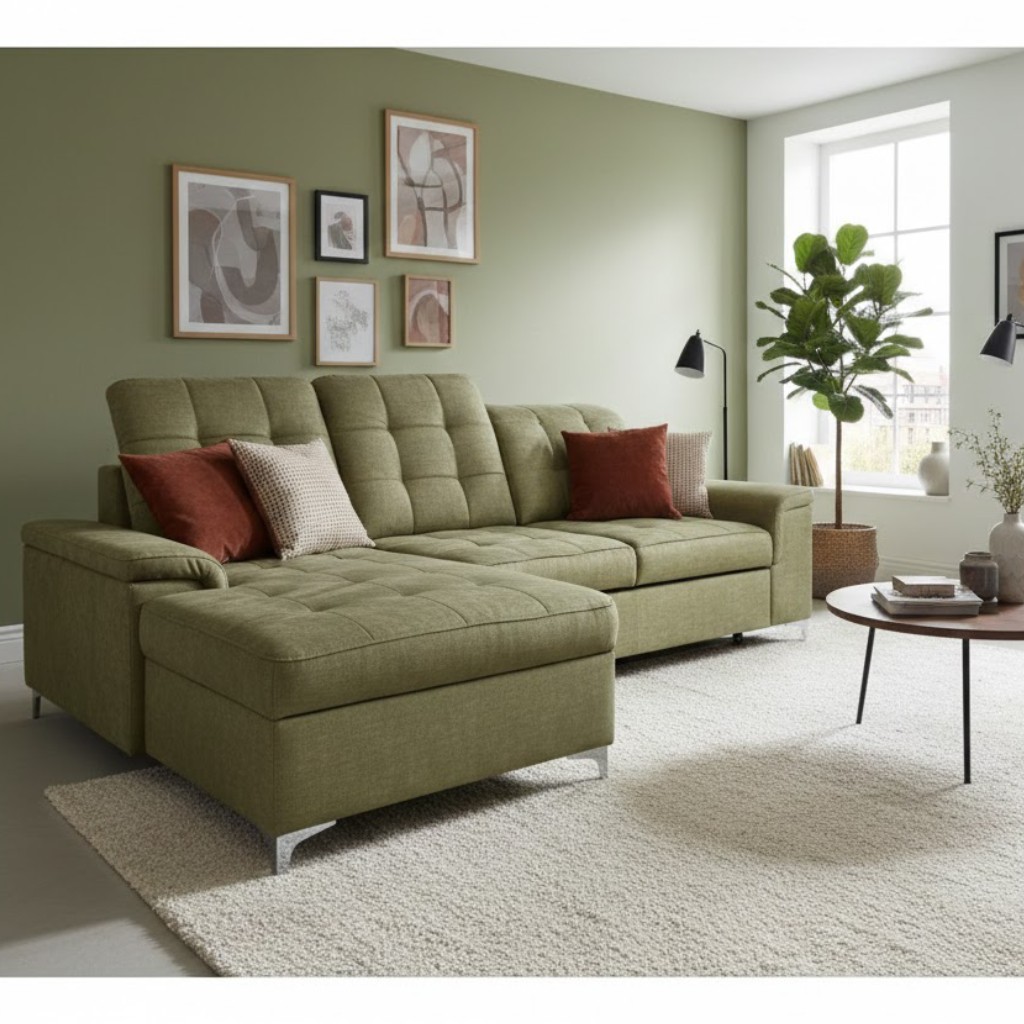 Pohodlná rohová sedací souprava ADRIANA je vyrobena v pravém rohu provedení - z pozice sedícího. Barevné provedení je v olivovém tónu. Látka Vogue 10 - kvalita OEKO - TEX, gramáž 370 g/m2, otěruvzdornost 105 tis. otáček. Dozajista osloví výrazné prošití sedáku a opěráku...