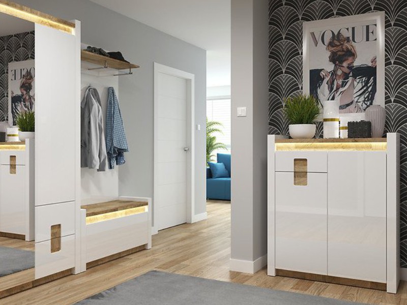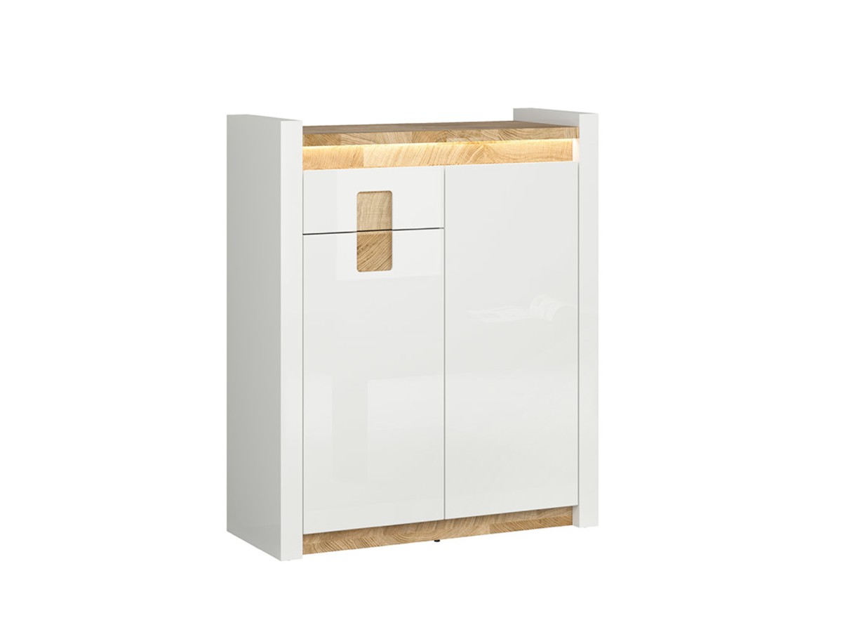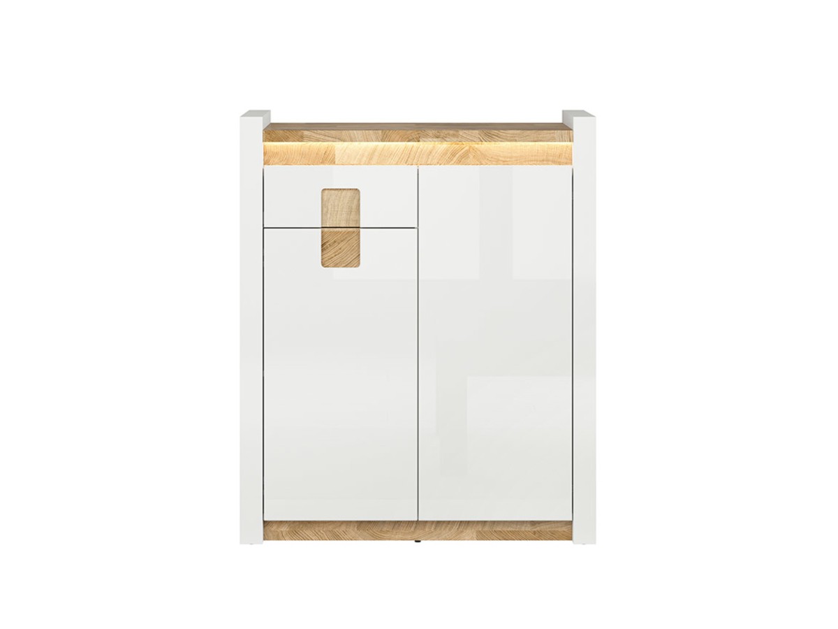 Zajímavá je také kombinace použití barev lesklé bílé konstrukce s vysokým bílým leskem na dvířkách. Kontrastem je pak vrchní deska a sokl zhotovené v barvě dub westminster s výraznou texturou, která zdůrazňuje celkový charakter komody.