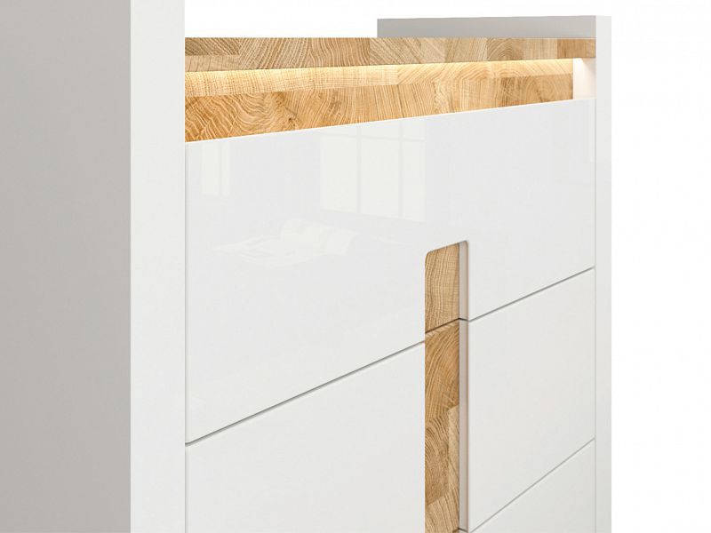 Zajímavé je použití barev lesklé bílé konstrukce s vysokým bílým leskem na dvířkách a kontrastní vrchní deska zhotovená v barvě dub westminster.