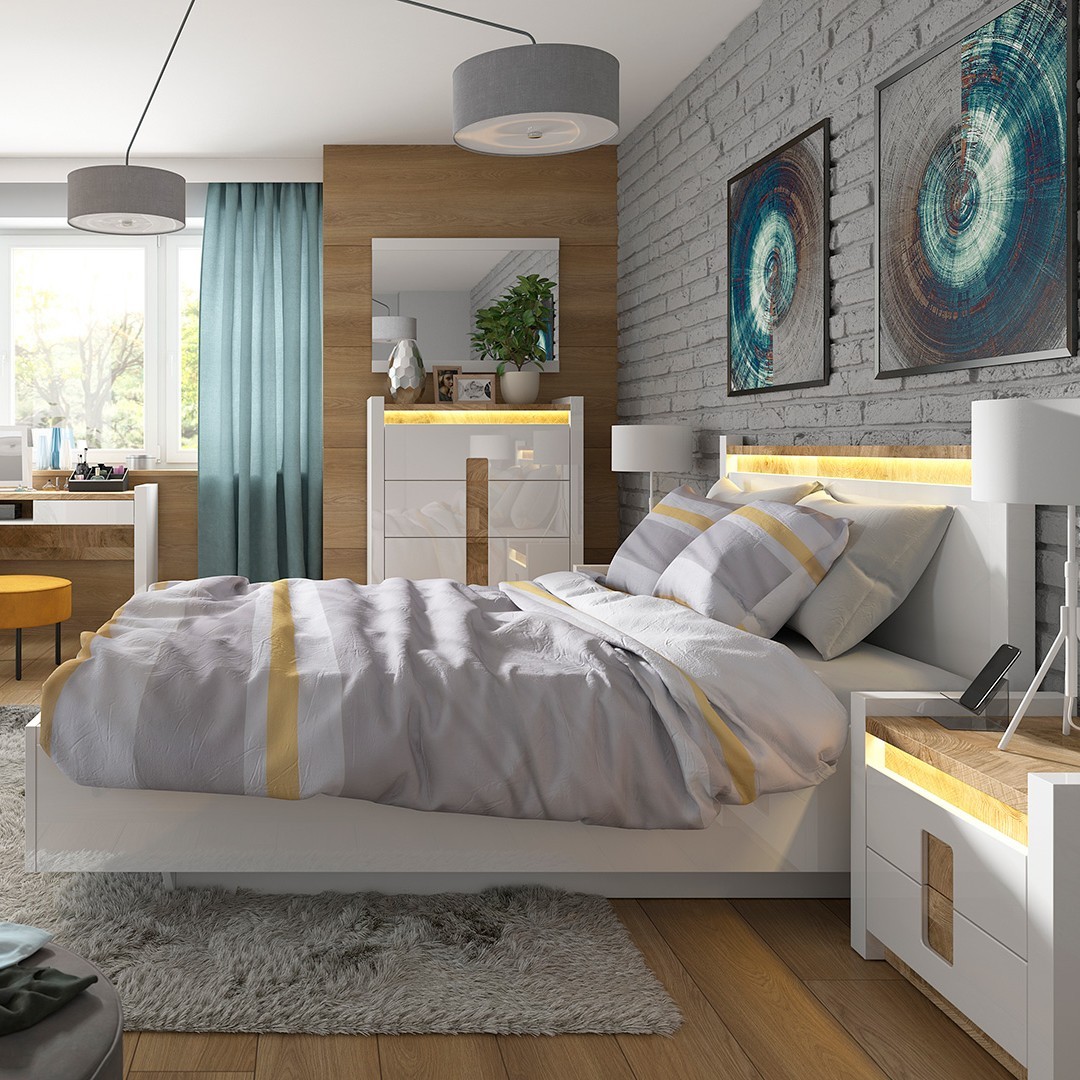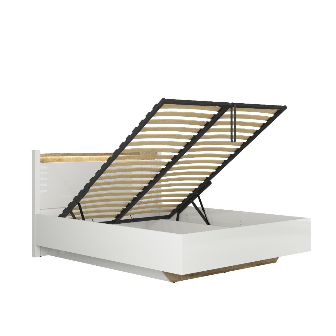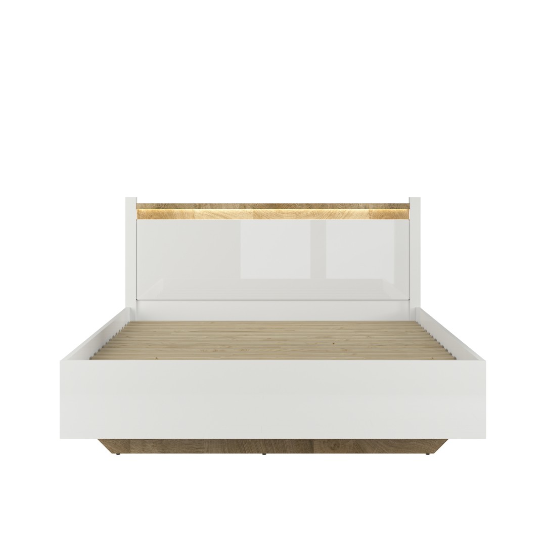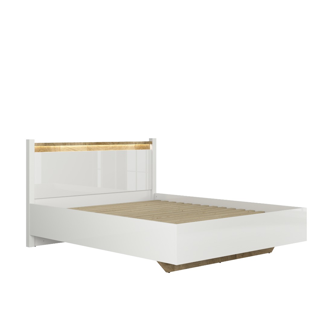 Postel ALAMEDA je vyrobena z lamina + MDF v kombinaci barev bílý lesk/dub westminster. Čelo postele je vybaveno LED osvětlením, jež je velice stylové.