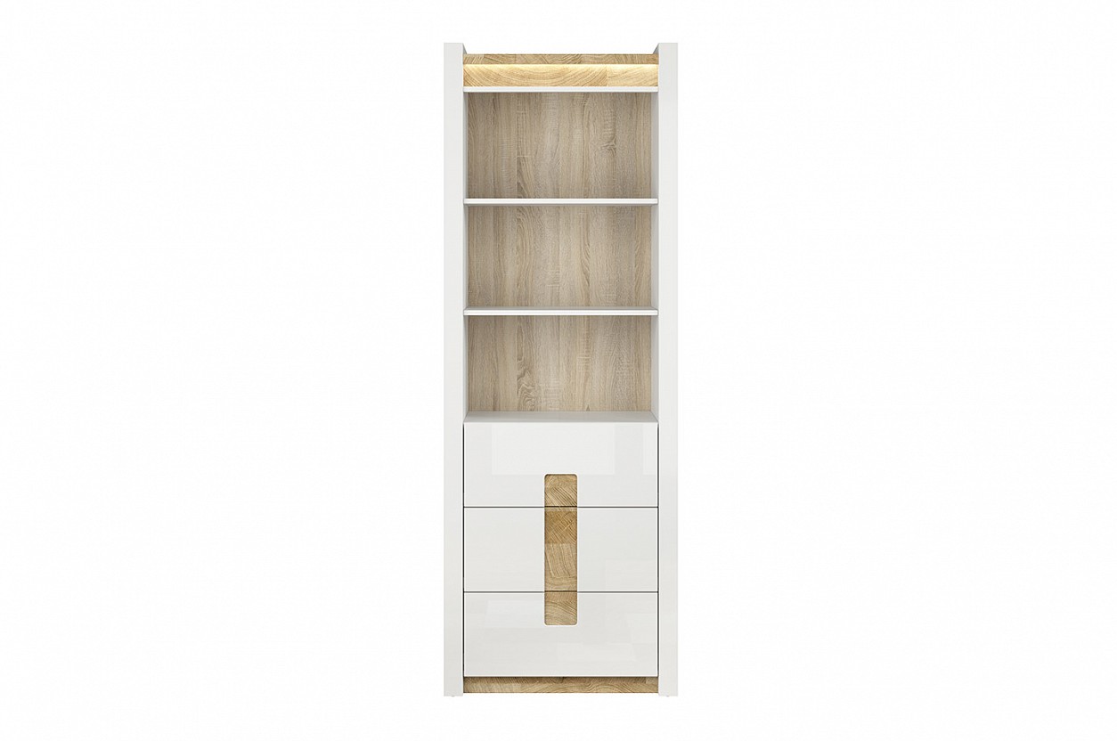 Regál je vyroben z lamina a MDF v kombinaci barev bílý lesk/dub westminster. Celkový vzhled regálu podtrhuje LED osvětlení, které je v ceně.