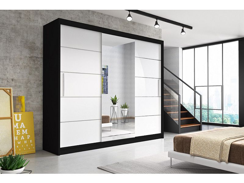 Prostorná šatní skříň Albatros je vyrobena z lamina v barevném provedení černá/bílá/zrcadlo - korpus, dveře. Dveře se skládají z jednoho celého panelu, součástí jsou lišty k nalepení, pro design jako na fotografii - rozdělení dveří na 5 částí.