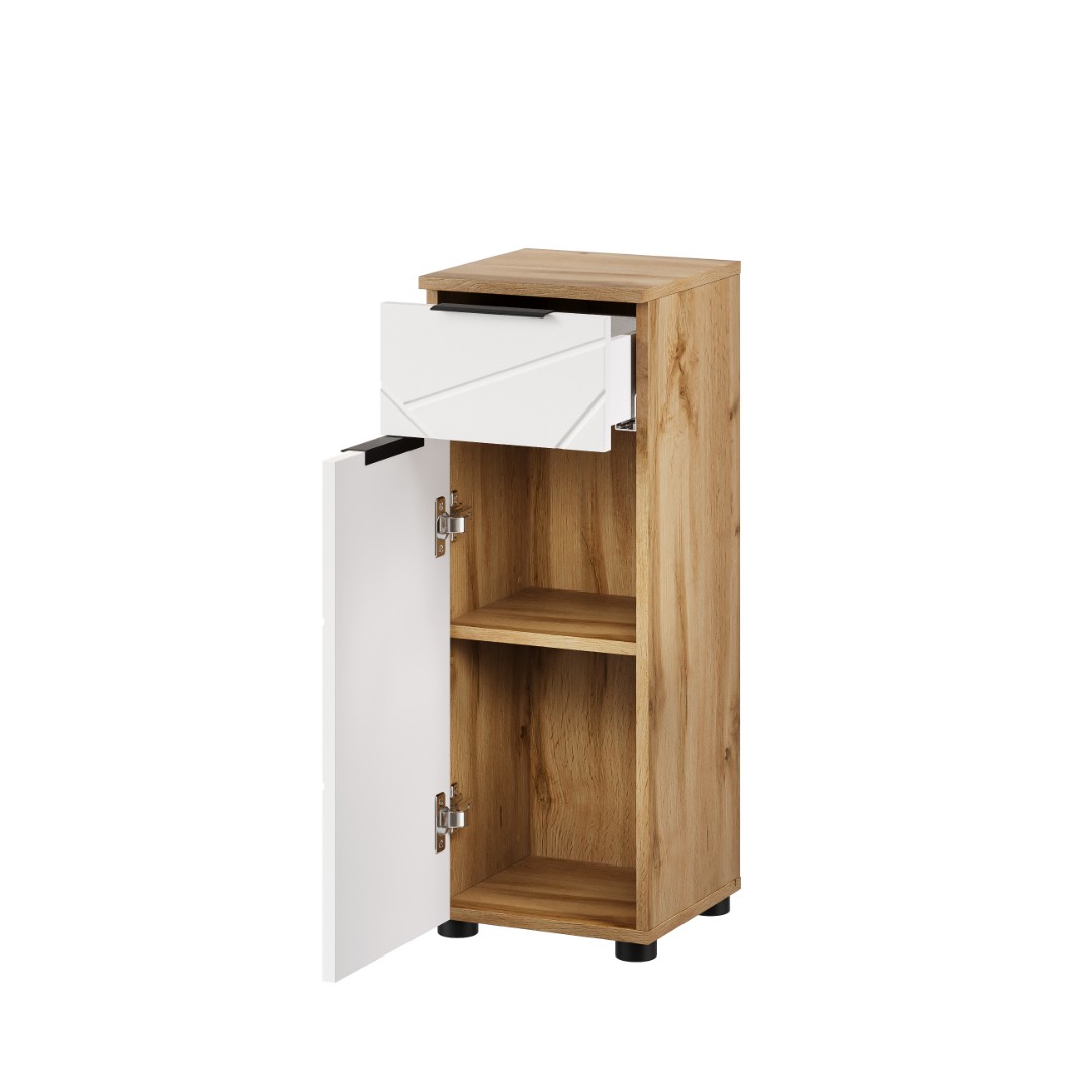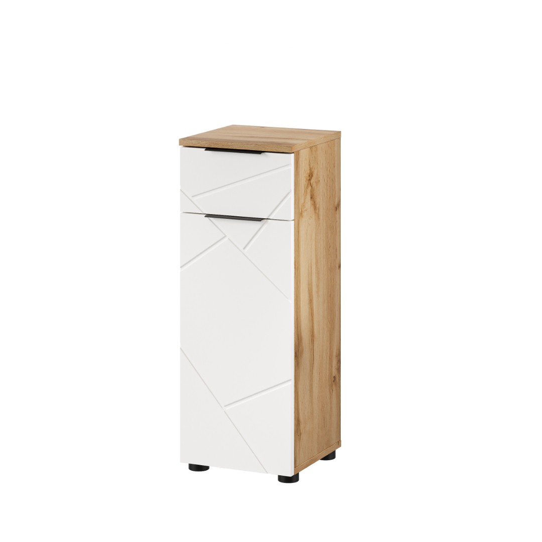 Součástí této skříňky je úložný prostor v podobě šuplíku a police uschované za dvířky. Díky tomu budete mít přehledně uschovány veškeré potřeby v koupelně, na jednom místě. Vyrobeno z lamina 16mm, dvířek z MDF 18mm. Dvířka mají geometrické frézování, typické pro tuto kolekci a praktické úchyty pro snadnější manipulaci při otevírání a zavírání nábytku. Barva - dub wotan/bílá.