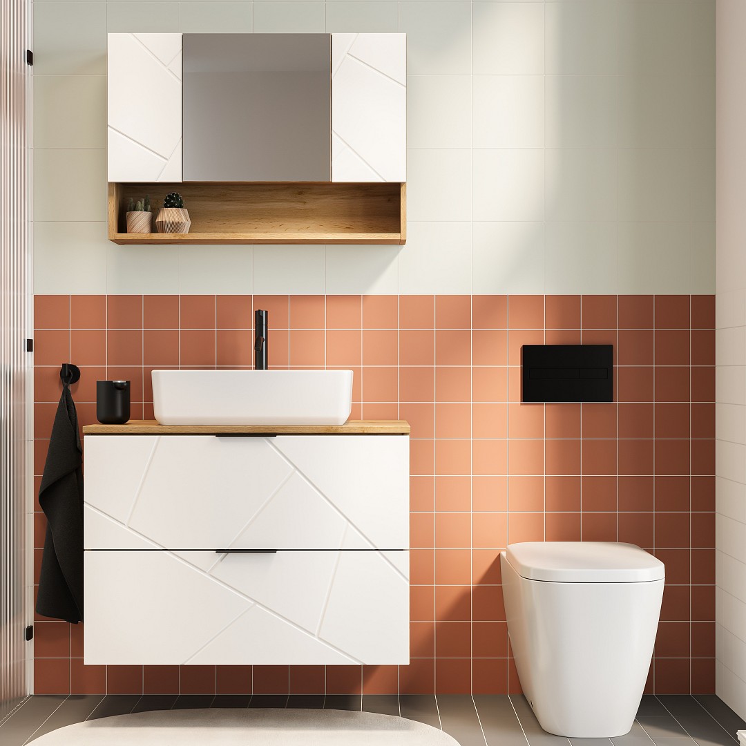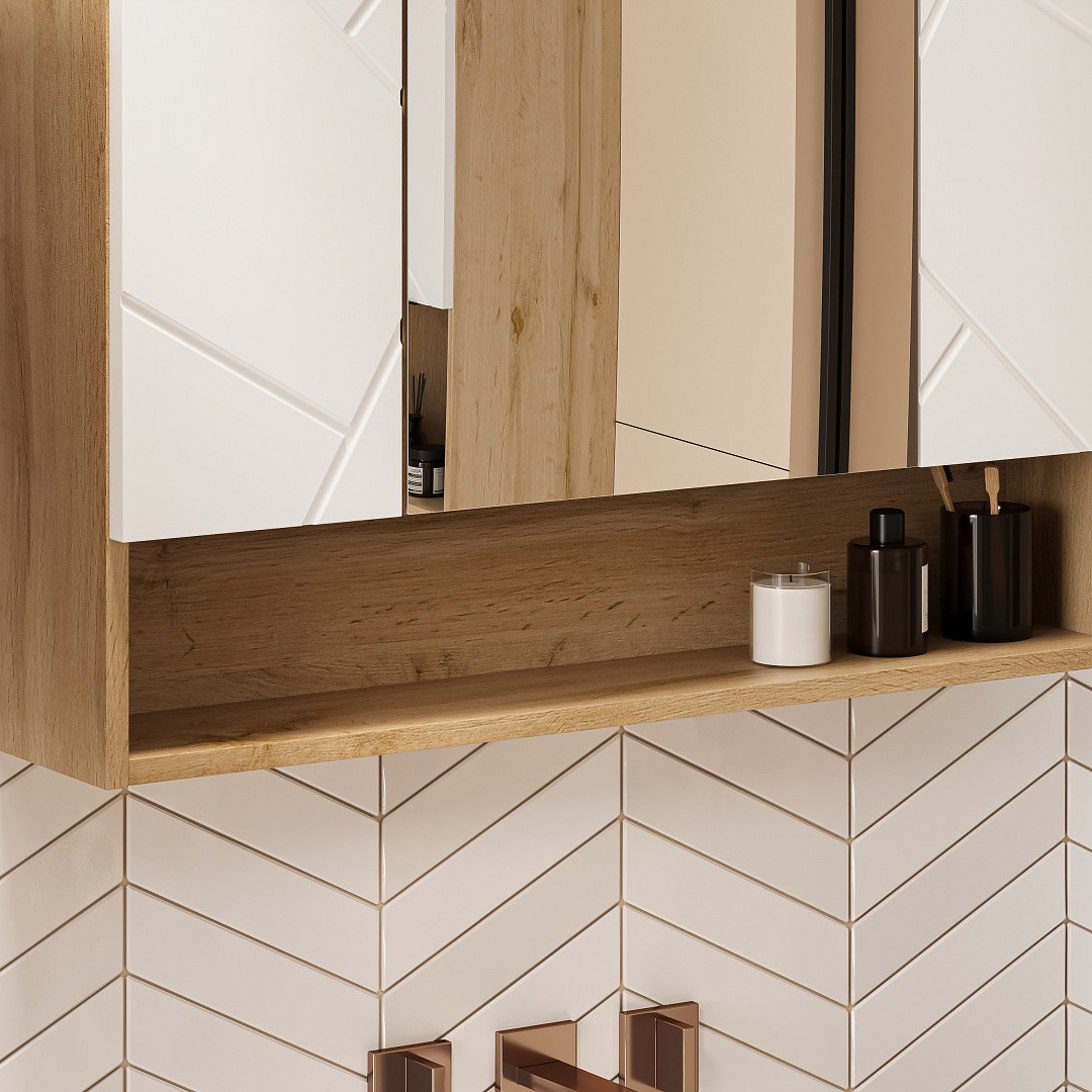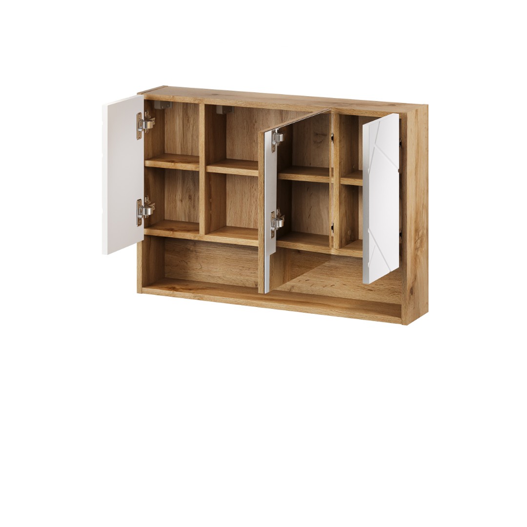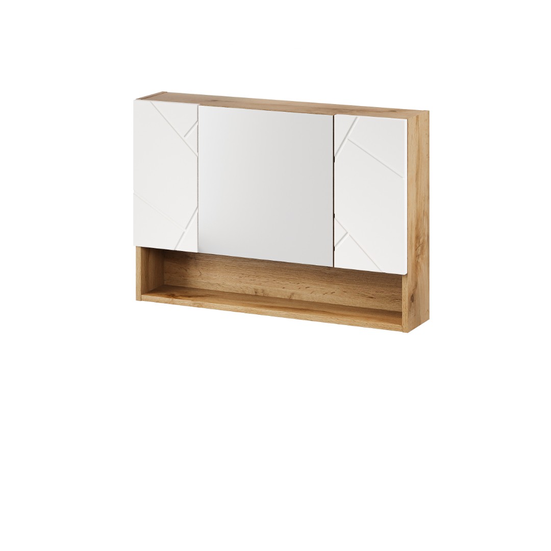 Za zrcadlovými dvířky se ukrývá policová část, jež umožní přehledně uschovat doplňky, jež potřebujete v koupelně mít při ruce. Navíc díky zavěšení skříňky na zeď, ušetříte místo v prostoru. Zrcadlo opticky zvětší a projasní místnost, což oceníte zejména v menších koupelnách. Vyrobeno z lamina 16mm, dvířek z MDF 18mm. Dvířka mají geometrické frézování, typické pro tuto kolekci. Barva - dub wotan/bílá.
