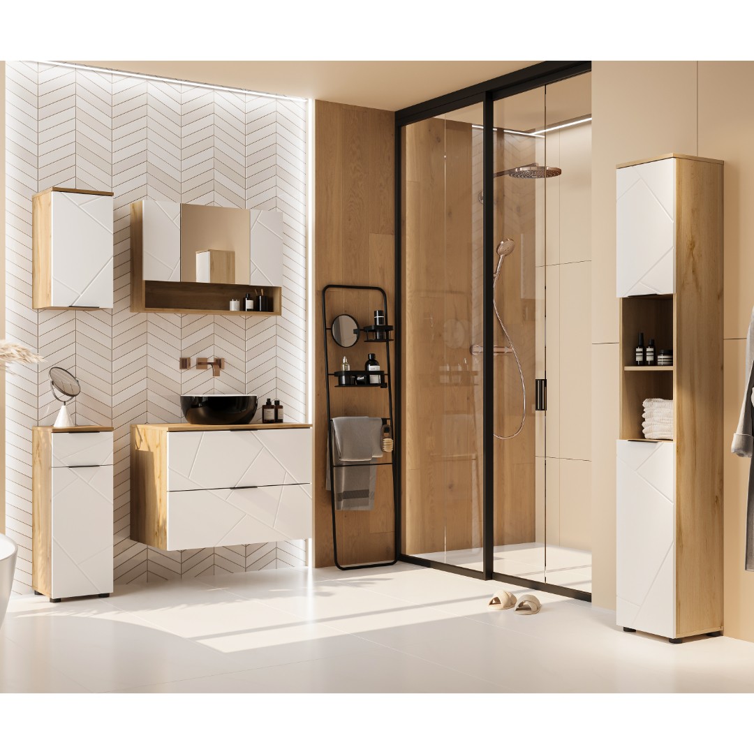 Vyrobeno z lamina 16mm, dvířka z MDF 18mm. Dvířka mají geometrické frézování, typické pro tuto kolekci. Barva - dub wotan/bílá. Dostupná je ve dvou barevných variantách, které ladí s ostatními prvky z kolekce – pro harmonický a ucelený vzhled celé koupelny.