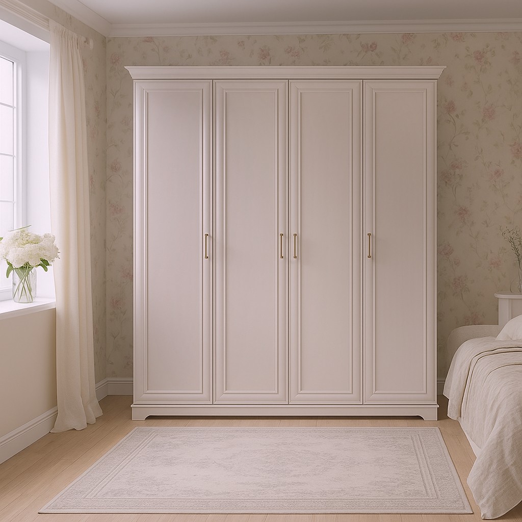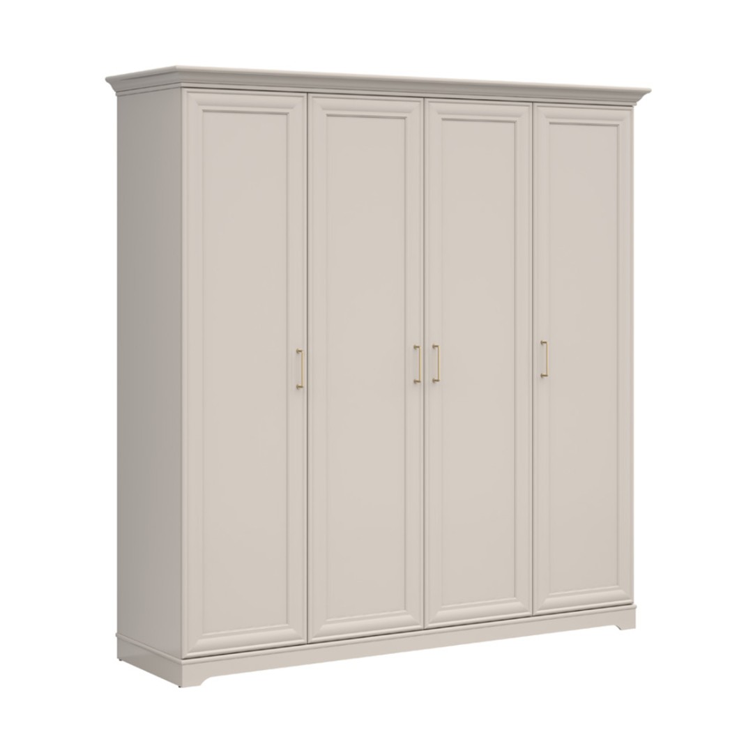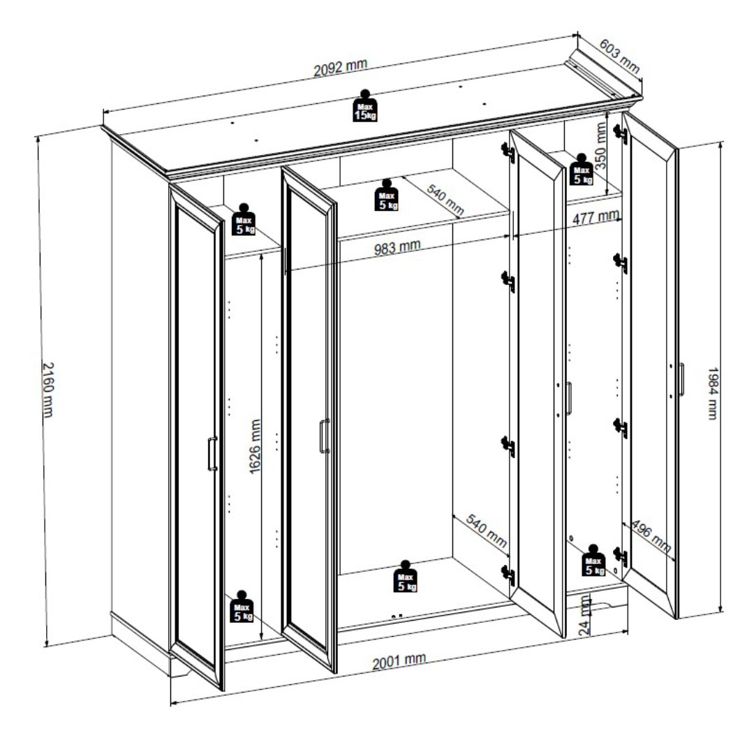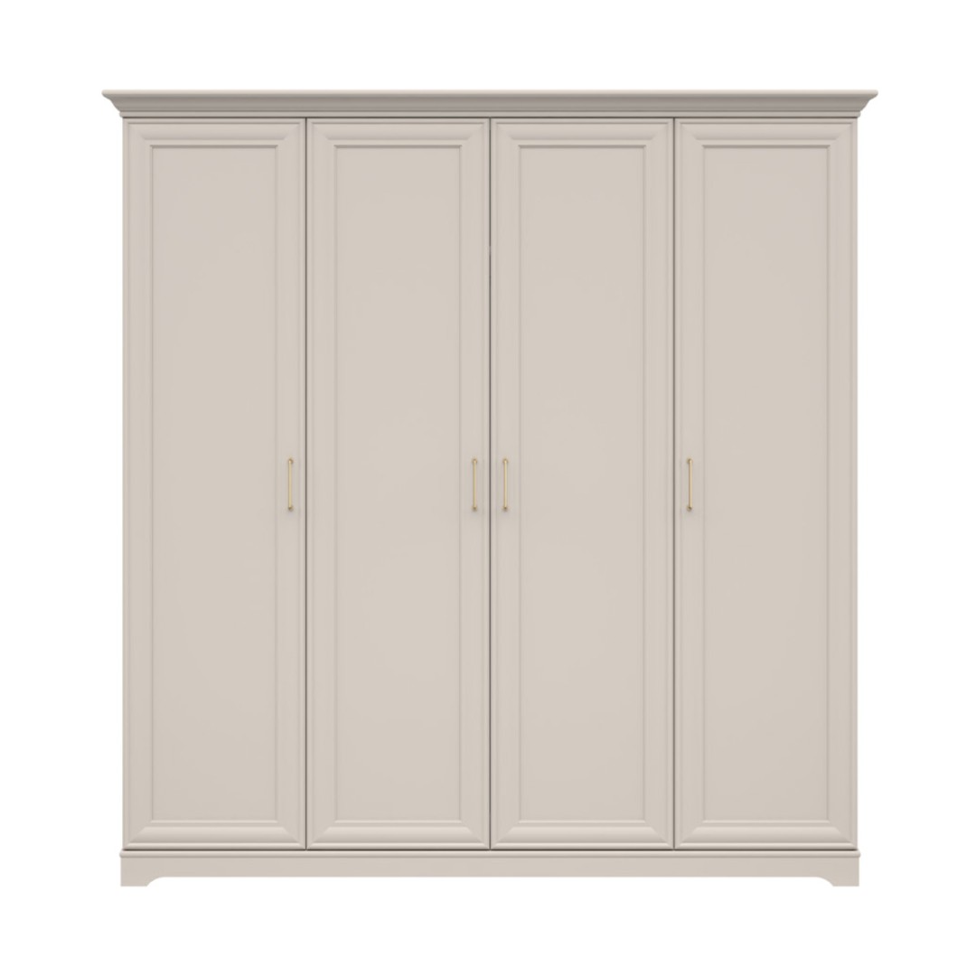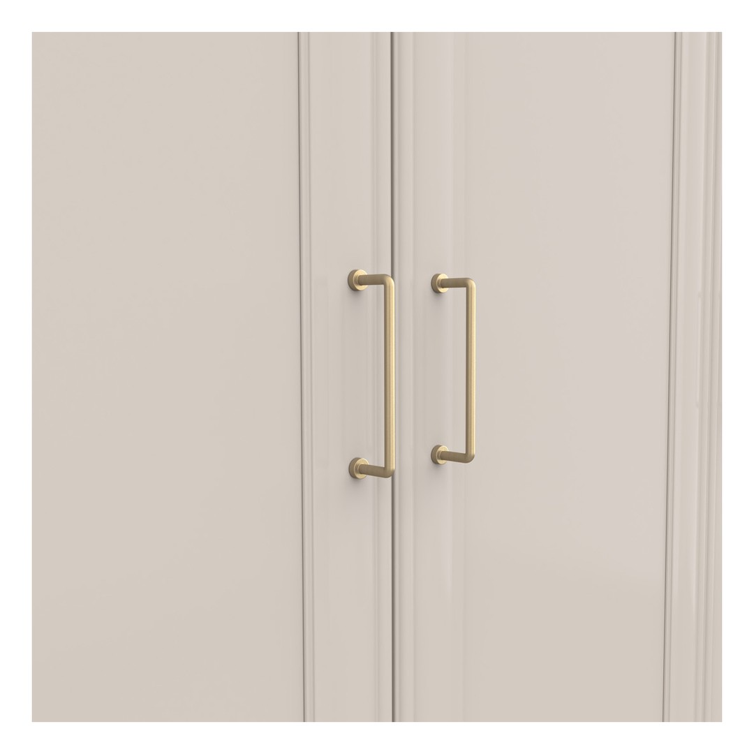 Součástí skříně ANGA jsou čtyři dvířka, díky nímž se snadno dostanete k uloženému oděvu. A aby byl přístup co nejsnadnější, jsou k dispozici také zlaté úchytky, pro snadnější manipulaci při otevírání a zavírání nábytku. Vyrobeno z lamina v kombinaci barev kashmir/dub mauvella. Za dvířky se ukrývají šatní tyče, ideální pro zavěšení košil, bund i kabátů. Díky systému soft-close se dveře hladce a tiše zavírají. Pro rozšíření úložného prostoru je možné dokoupit sadu tří přídavných polic viz související zboží.