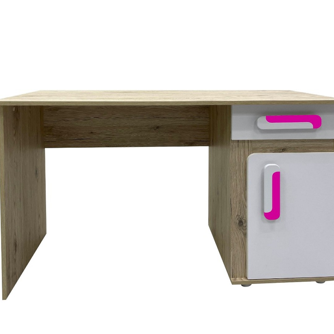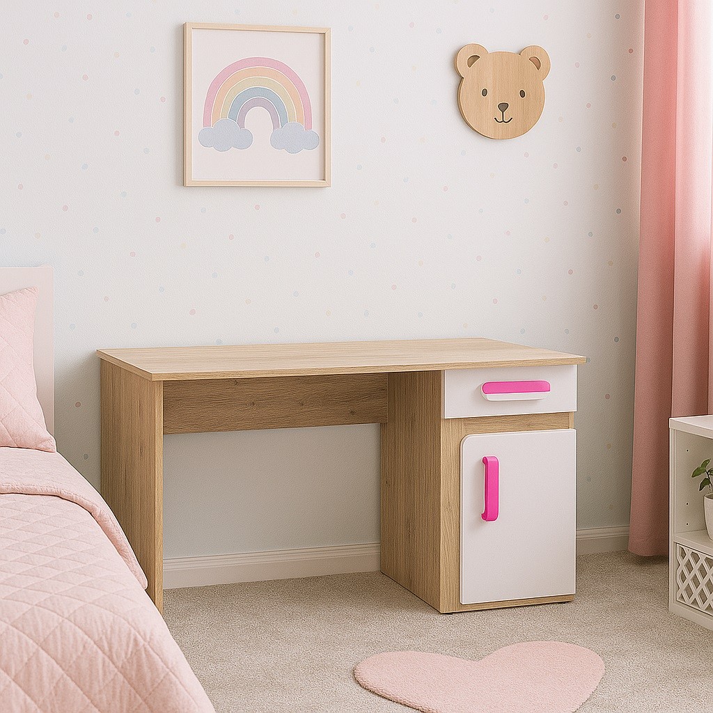Tento stůl je vyroben z vysoce kvalitního lamina s přírodním dubovým odstínem, který přináší do prostoru pocit tepla a přirozenosti. Pro vytvoření ještě zajímavějšího a stylového designu je kombinován s okouzlující růžovou barvou, která dodává nádech jemnosti a elegance. Krásně se bude vyjímat zejména v pokojíčku dívek.