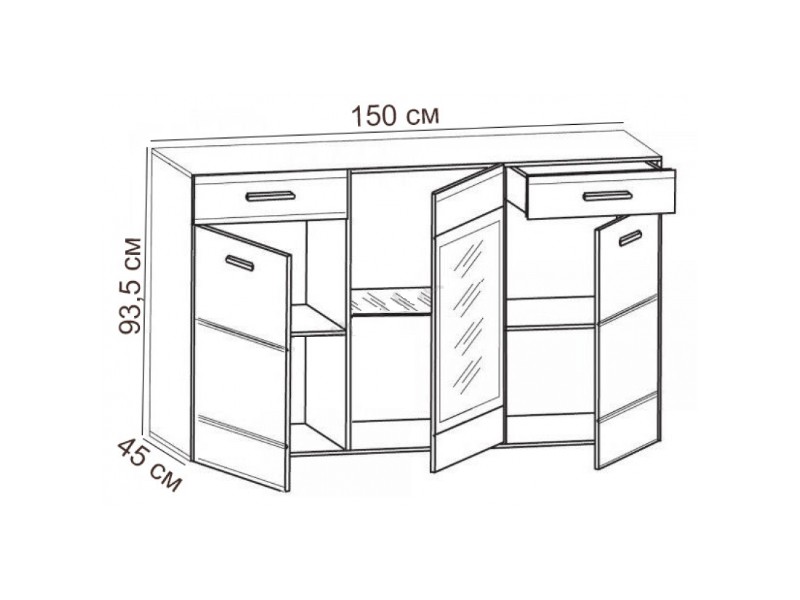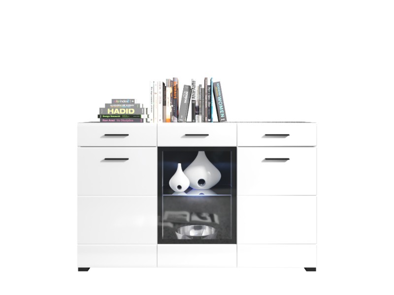 Po stranách komody vám budou k dispozici dvě skříňky s plnými dvířky. V každé skříňce se nachází jedna police. Prostřední díl komody tvoří prosklená dvířka, díky kterým vynikne LED osvětlení skleněné police.