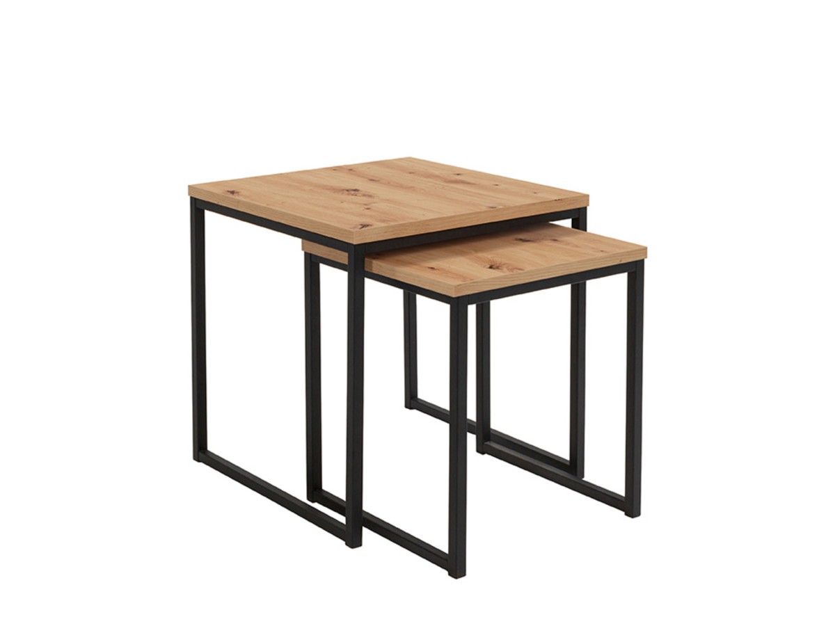 Sada dvou konferenčních stolků AROZ je vyrobena v barvě dub artisan Konstrukce je kovová v černém provedení.