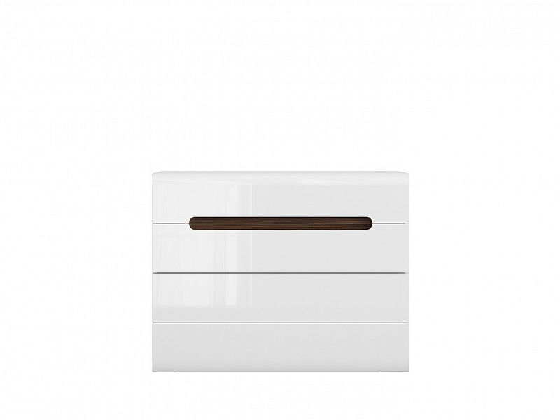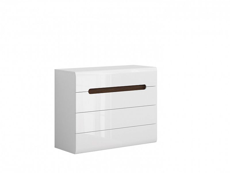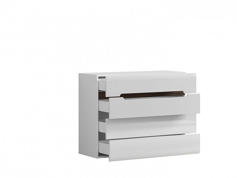Komoda má 4 zásuvky na pojezdech s pomalým a tichým dojezdem. Dvě horní zásuvky mají úchyt na přední straně a dvě spodní zásuvky mají nenápadné úchyty po stranách čel zásuvek.