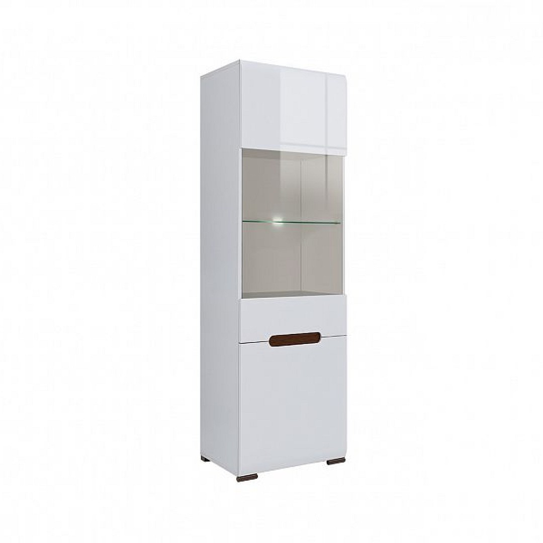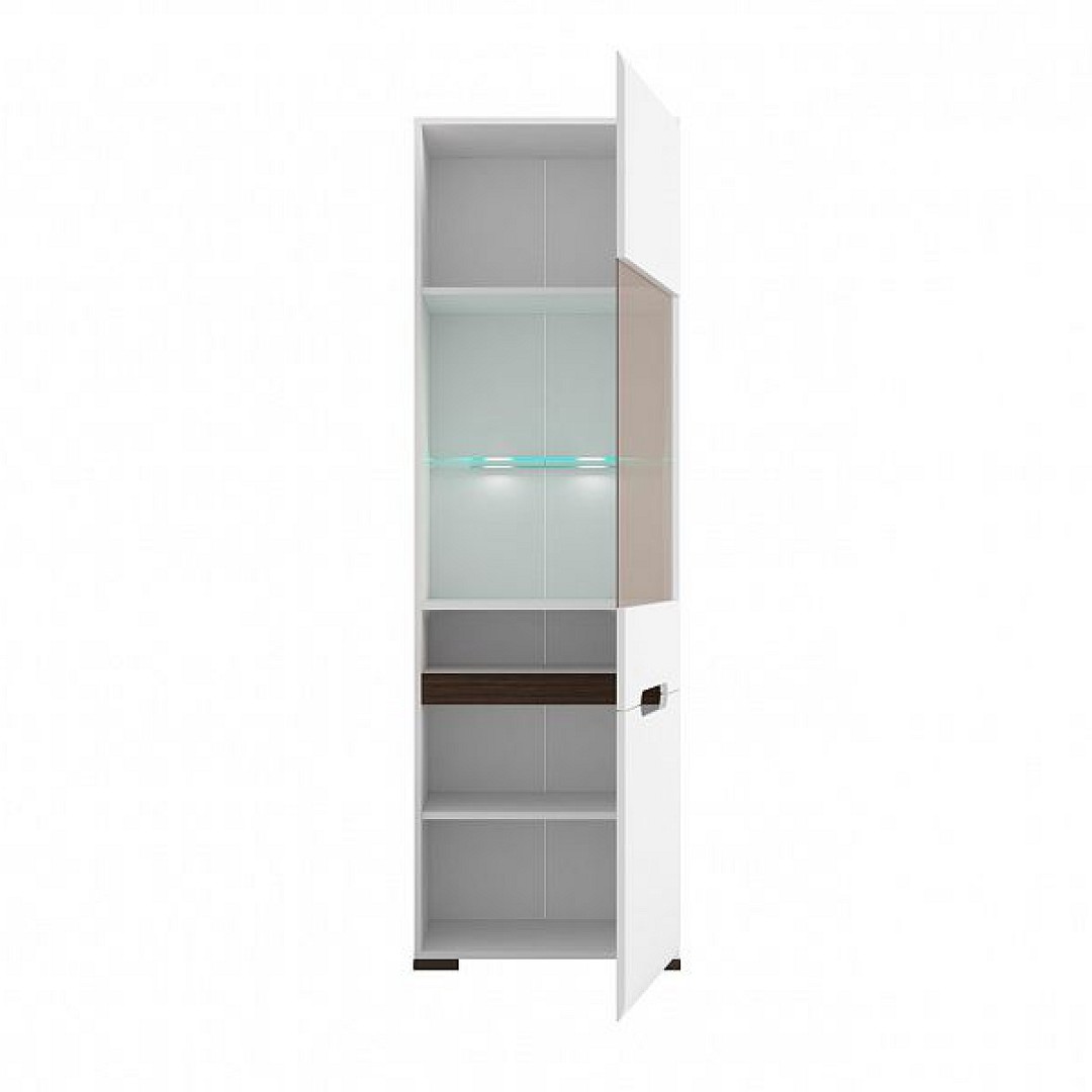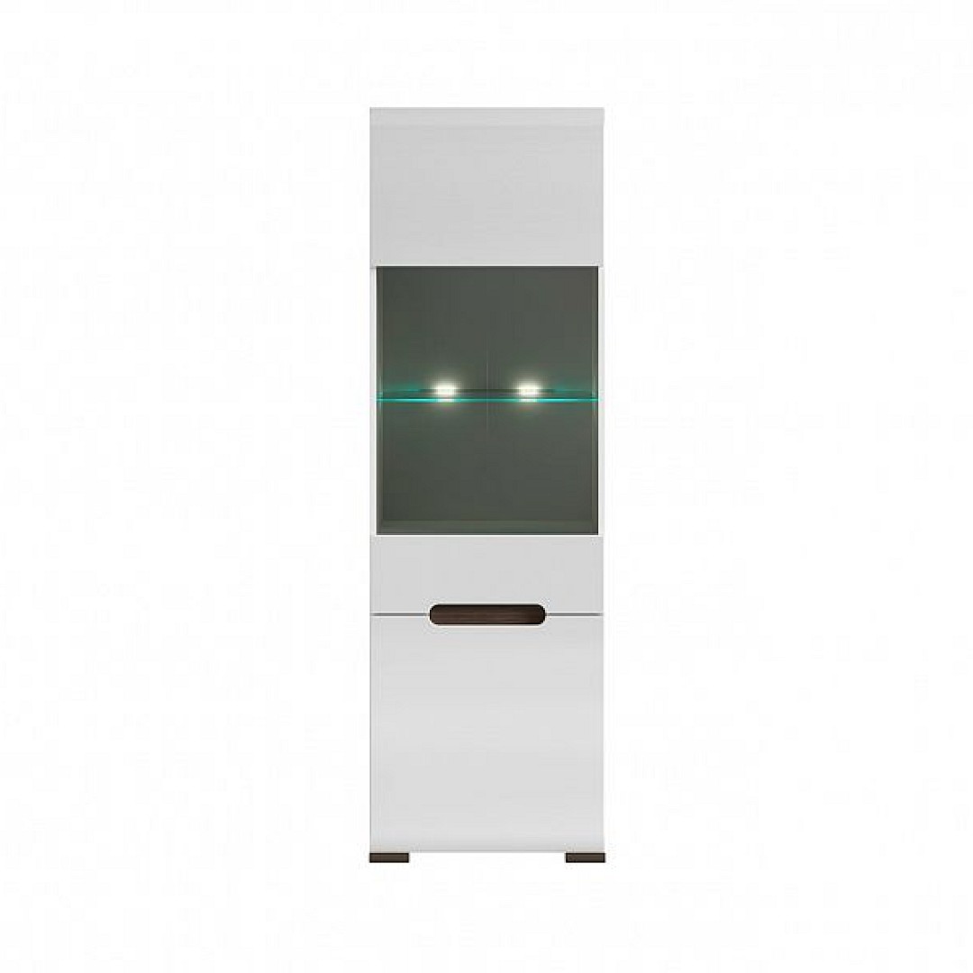 Vysoká a úzká vitrína Azteca Trio REG1W1D/19/6 je v bílém barevném provedení s čely v bílém lesku. Vitrína je rozdělena na dvě části. Ve spodní části je 1 police, ve vrchní části jsou celkem 3 police, z toho je 1 skleněná s LED osvětlením.