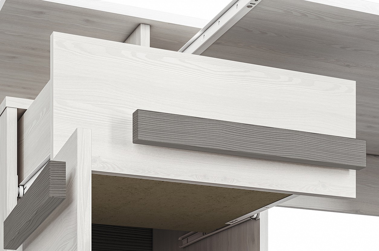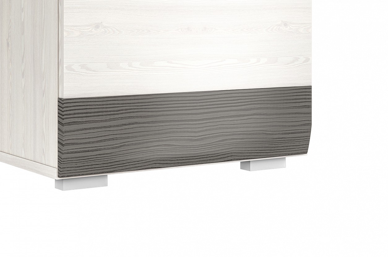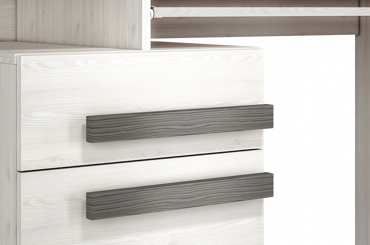 Stůl BERNIS je vyrobený z lamina v barevném provedení borovice bílá/borovice bílá/šedá. Dekorační tmavá lišta je vyrobená z MDF materiálu. Úchytky jsou velice výrazné, zaujmou na první pohled.