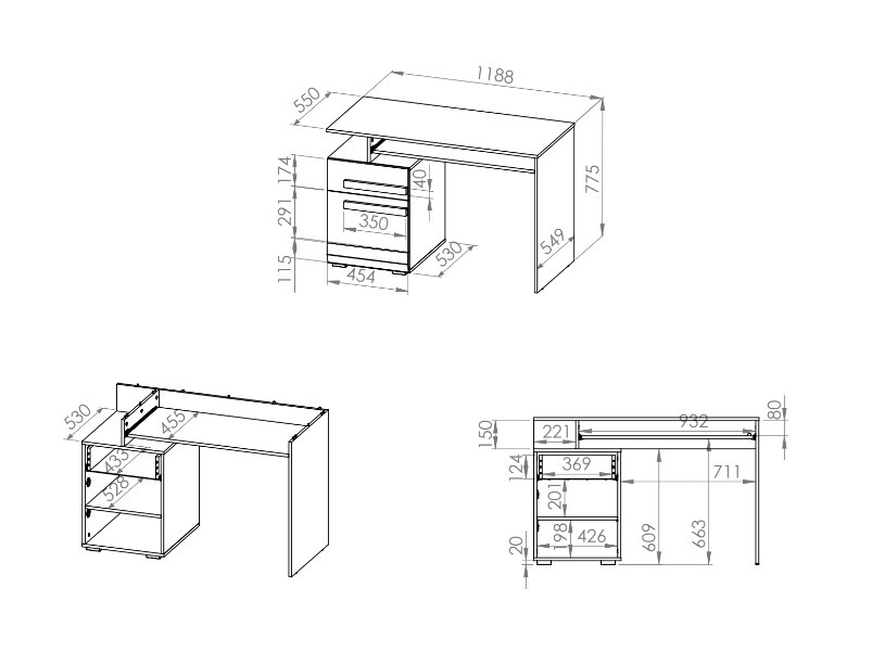 Úložný prostor je v podobě veliké pracovní desky, pod ní se nachází vysouvací deska na klávesnici. Nechybí ani otevřené a uzavřená police + 1 zásuvka. Zásuvka má speciálně vyztužené dno.