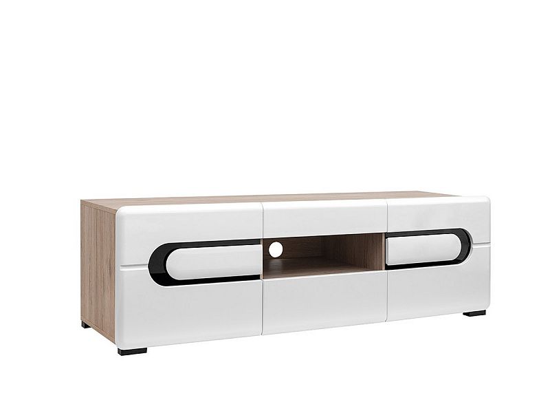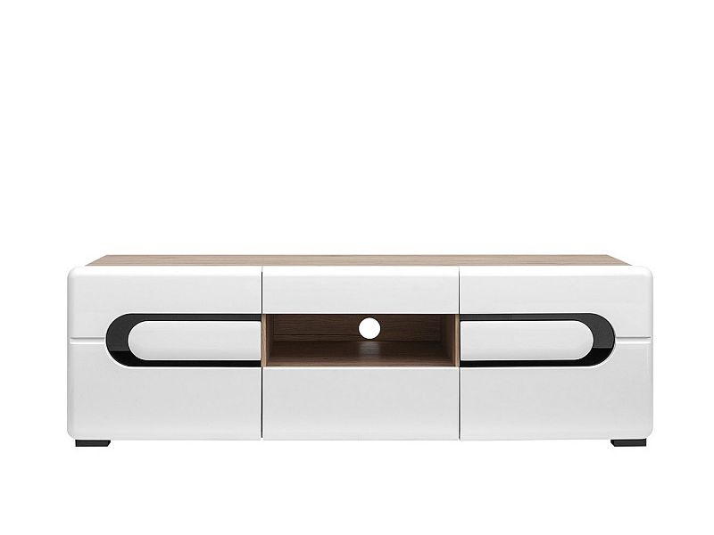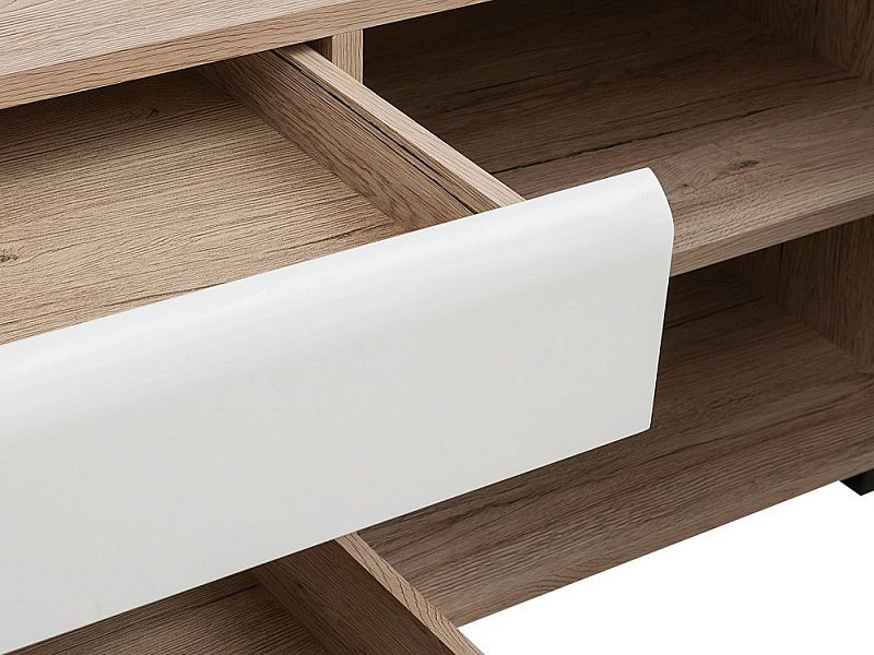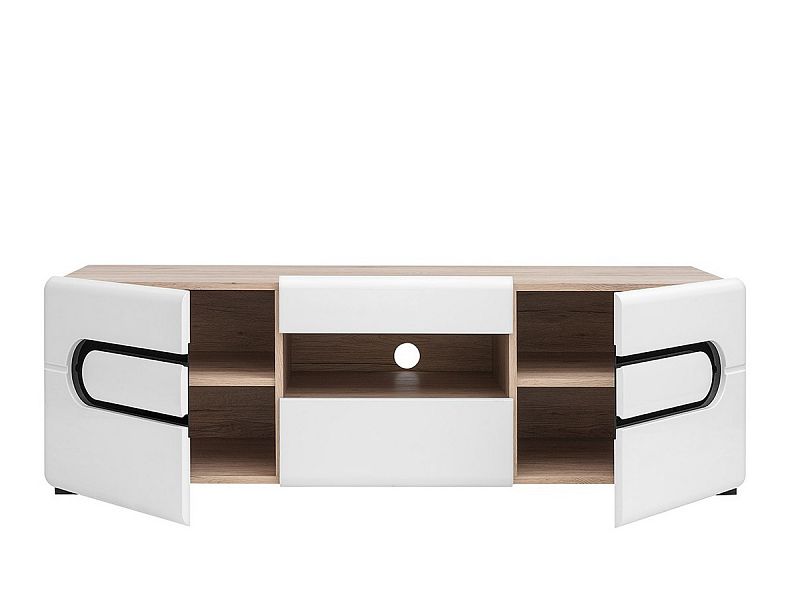 TV stolek nabízí dostatek úložného prostoru, který tvoří uzavřené boční skříňky, 2 zásuvky a otevřená polička vhodná pro umístění elektroniky.