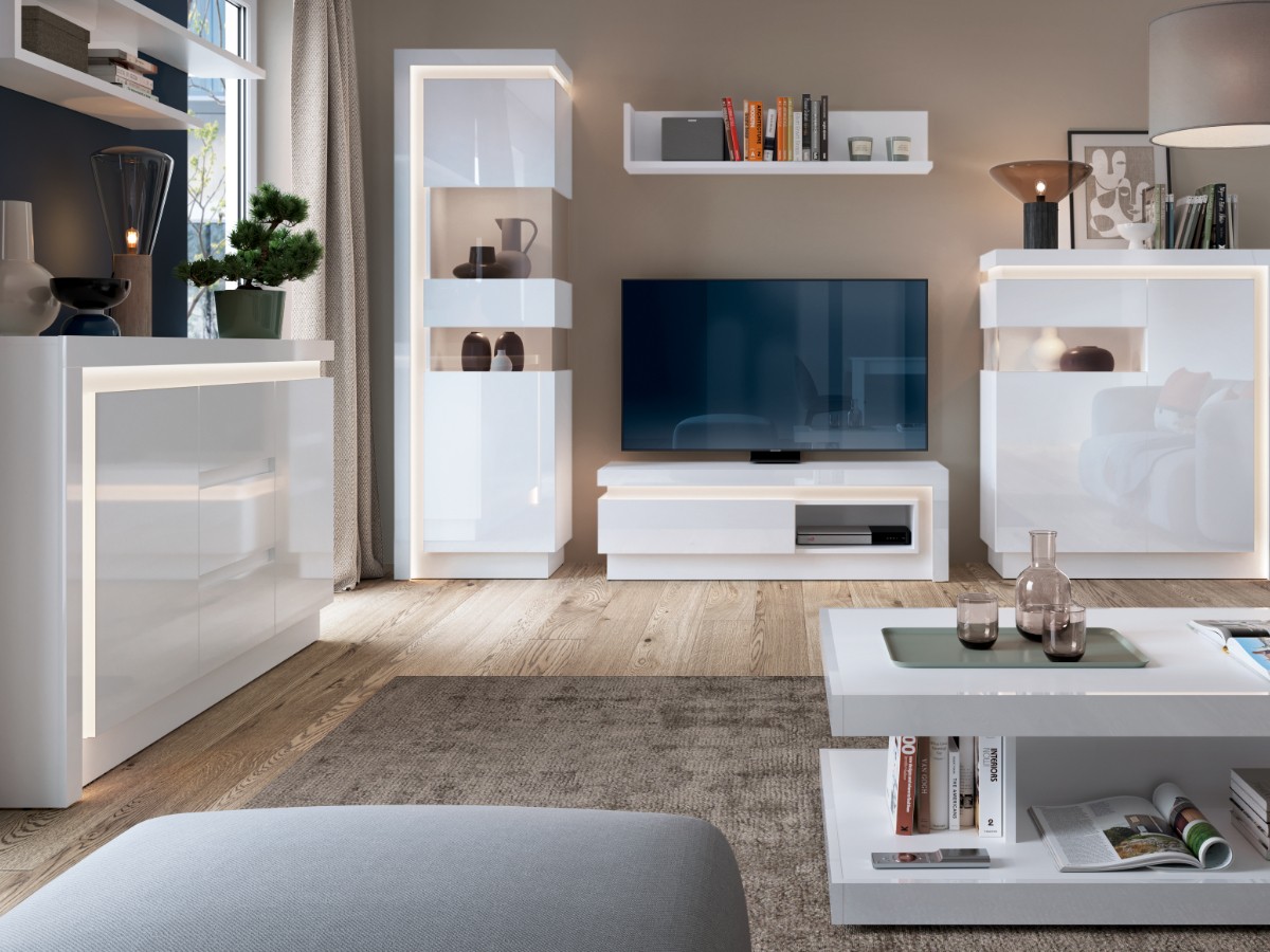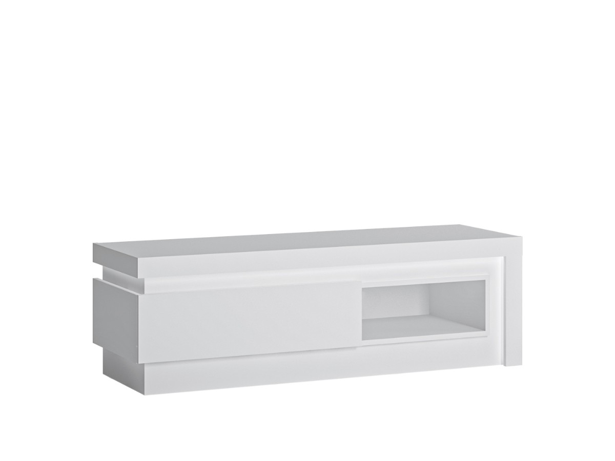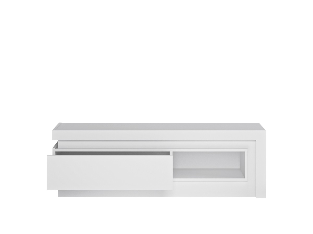 Televizní stolek CANTUS je vybaven zabudovaným LED osvětlením umístěným pod hranou korpusu. Poskytuje tak pohodlné a příjemné světlo, které dodá místnosti zvláštní náladu. Má také úložný prostor ve formě otevřené police a zásuvky, která je ideální pro uschování drobných předmětů. Zásuvka je vybavena systémem tichého dovírání, což zajišťuje pohodlné otevírání a zavírání.