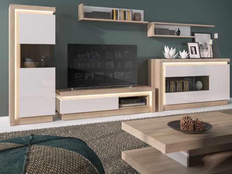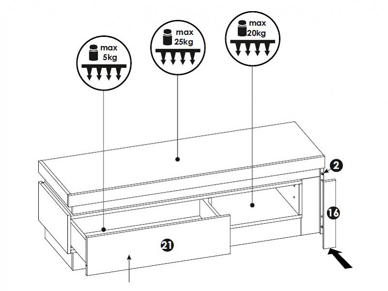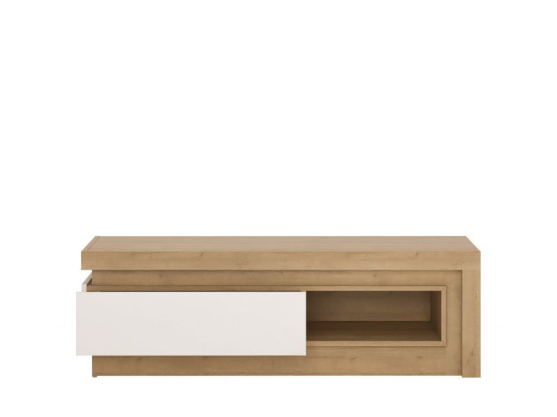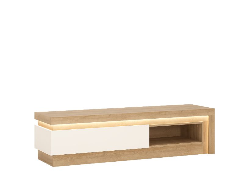 Televizní stolek CANTUS má k dispozici zabudované LED osvětlení, které se nachází pod hranou korpusu. Úložný prostor je v podobě otevřené police a zásuvky, vhodné pro uschování drobností.