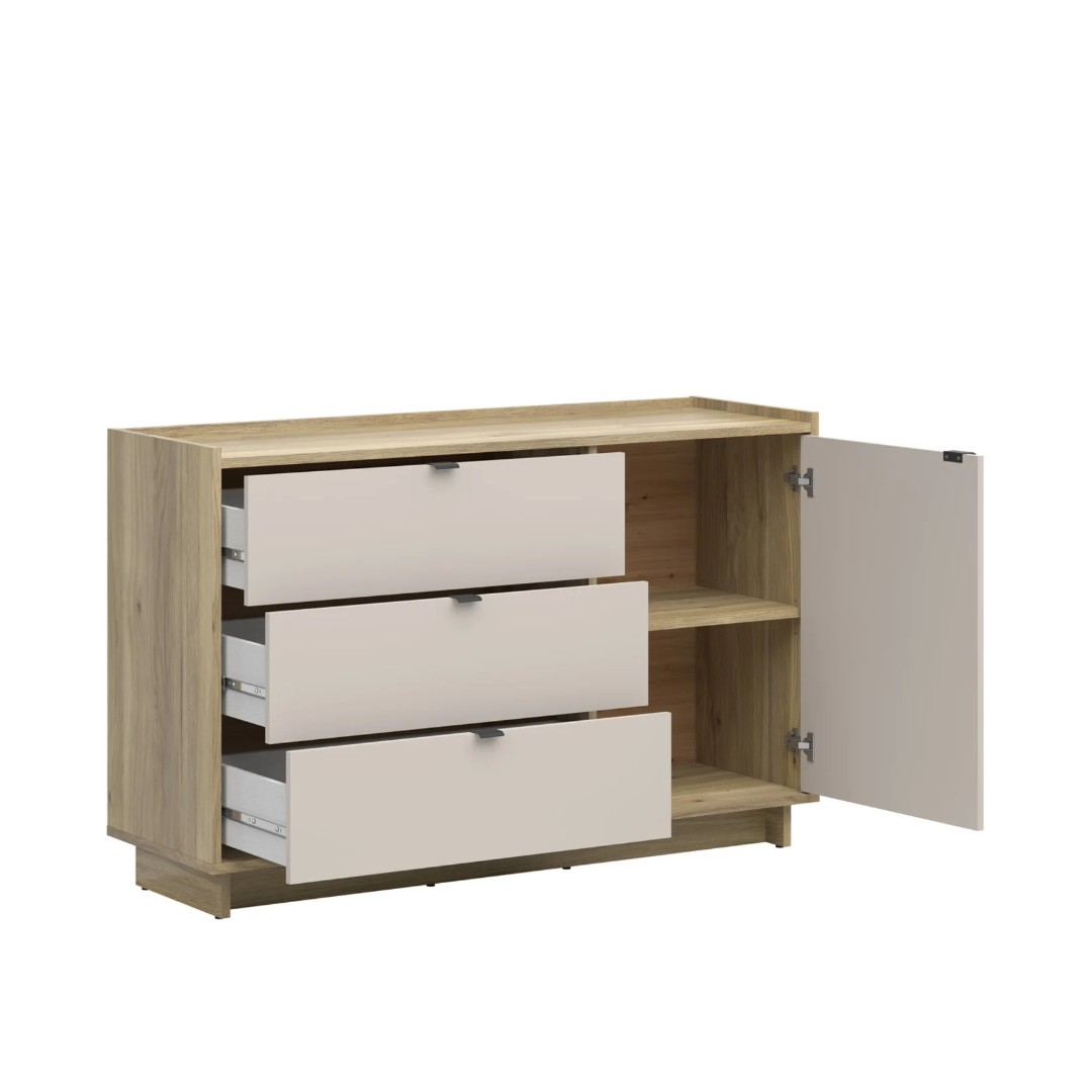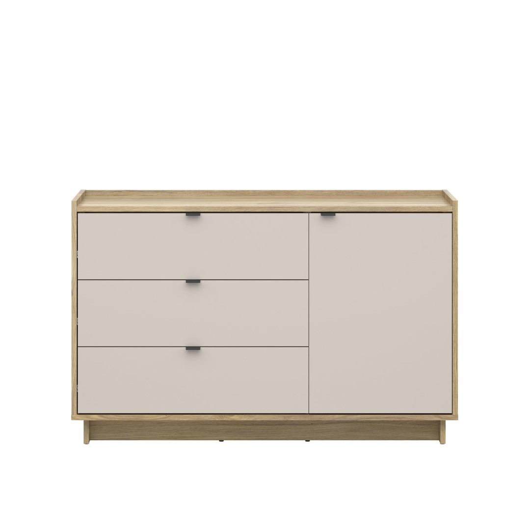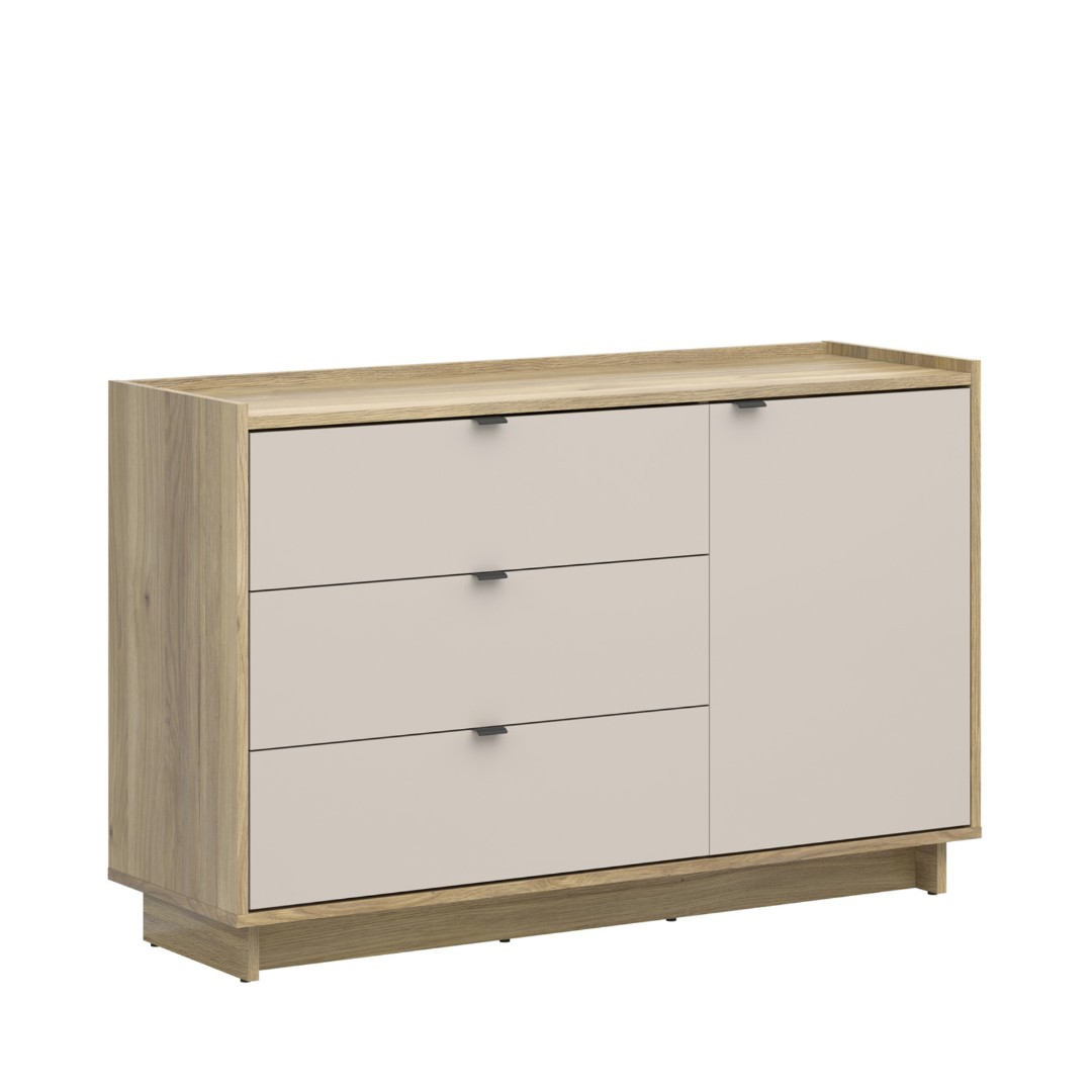 Barevné provedení této komody je v kombinaci tónů dub mauvella/kashmir. Jde o netradiční barevné propojení, které ovšem působí velice příjemně. Vyrobeno z laminované desky. Komoda nabízí praktické řešení úložného prostoru – tři prostorné zásuvky a za dvířky ukrytá police, ideální na oblečení, dokumenty nebo další doplňky.