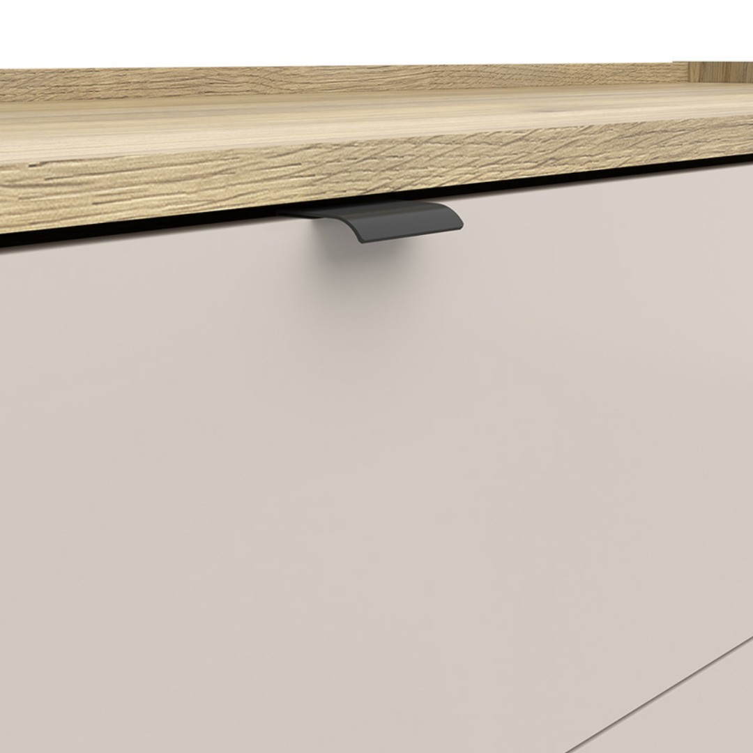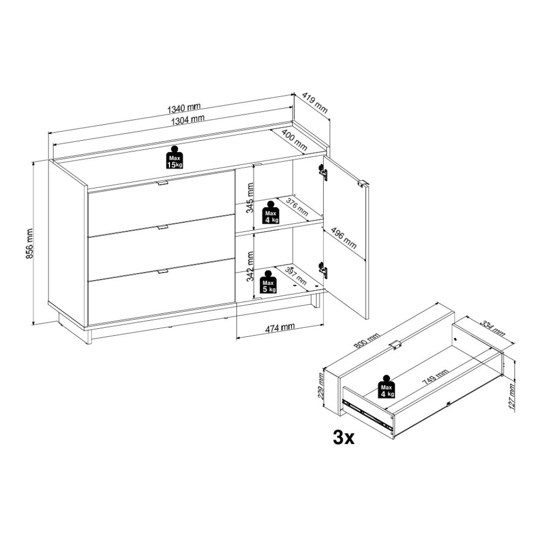 Moderní hliníkové úchyty nejen skvěle vypadají, ale také usnadňují každodenní používání. Díky svým rozměrům (134 × 86 × 42 cm) se komoda hodí i do menších prostorů, aniž by ztratila na praktičnosti.
