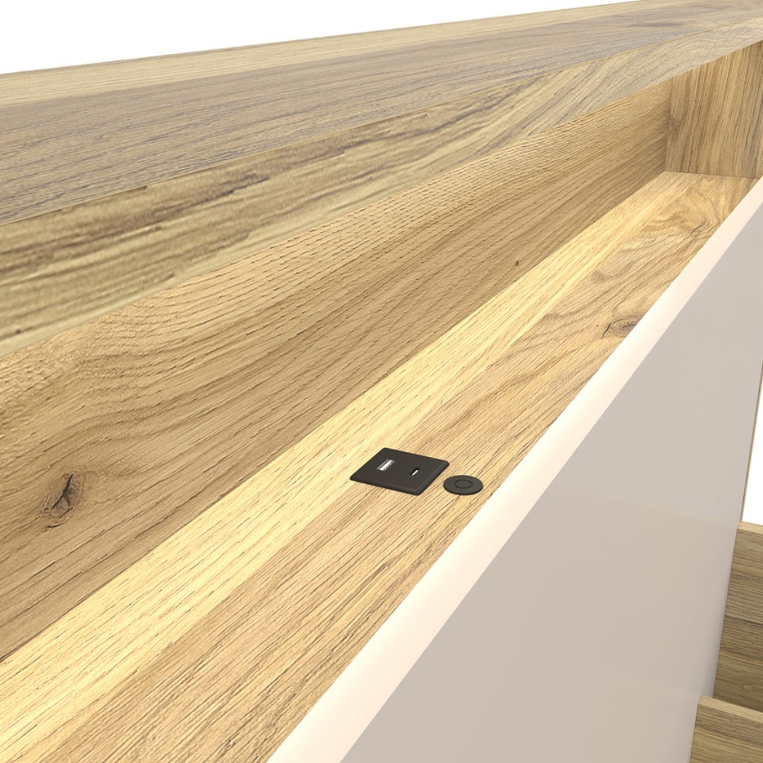 Postel DALVA je vyrobená v kombinaci barev dub mauvella/kashmir. Ideální pro odpočinek po náročném dni. Dozajista upoutá pozornost na první pohled vysoké čelo postele s decentním LED osvětlením a zabudovaným USB portem. V čele je také k dispozici odkládací police, která vám umožní odložit právě rozečtenou knihu, nebo jiné potřebné maličkosti.