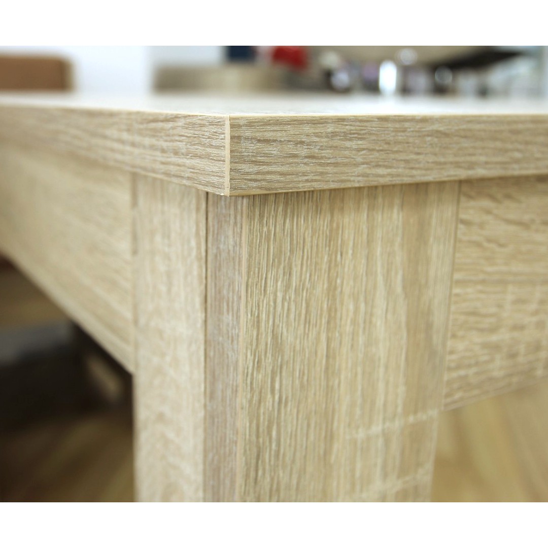 Jeho barevné provedení je v oblíbeném tónu dub sonoma, který se snadno kombinuje s ostatním nábytkem v domě. Stůl je vhodný k umístění do jídelen i kuchyňských koutů. Díky jeho kompaktním rozměrům je možné umístit stůl také do menších prostorů. Vnitřní rozteč nožek od sebe na délku 90 cm, na šířku 48 cm.