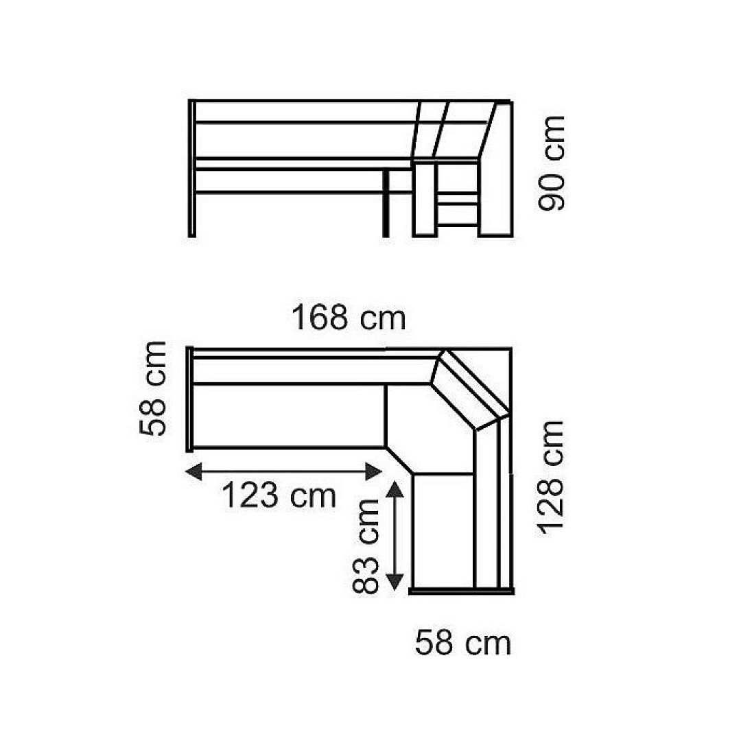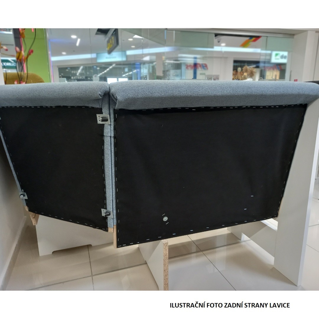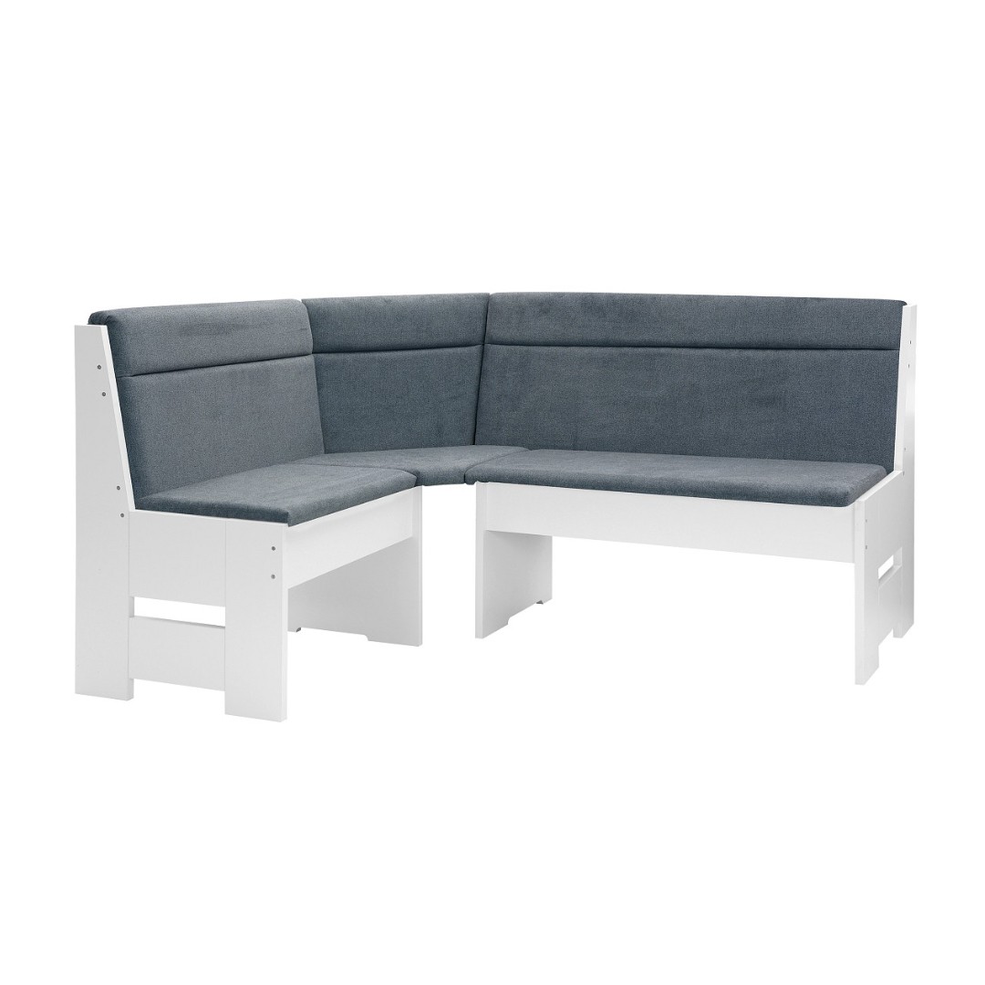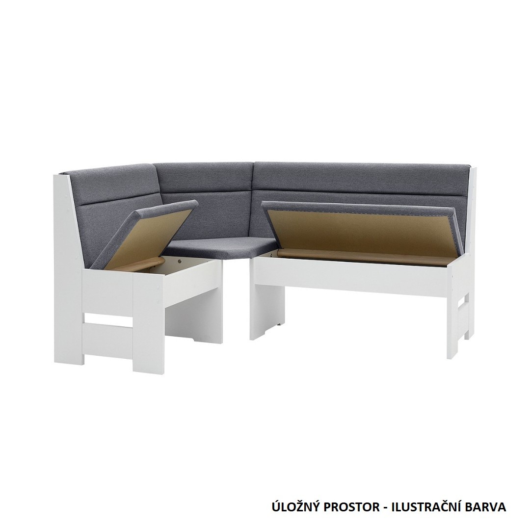 Je vyrobena z lamina v bílém tónu. Její čalounění je v šedé látce PW14. V nabídce spoustu dalších barev viz barevné varianty. Je vhodná pro vytvoření dalšího místa k sezení pro vás a vaše hosty. Navíc oceníte úložný prostor, který je součástí nábytku a nachází se v obou rohových částech.