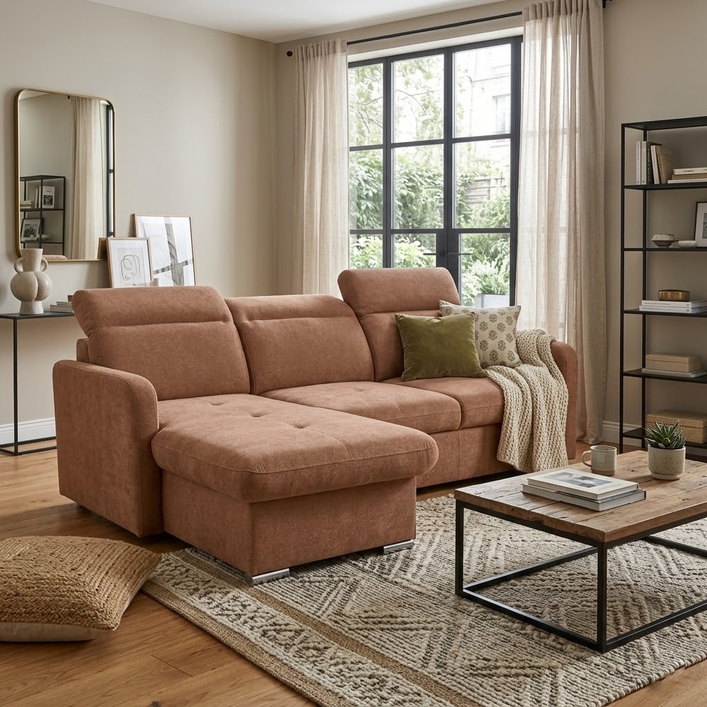 Čalounění je v terracotovém tónu. Látka Storm 54 - typu Easy clean - pro snadné čištění vodou. Zadní část je také čalouněna a proto je vhodná k umístění do prostoru.