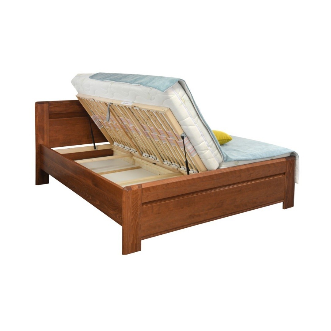 Barevné provedení je v tónu višeň. Na čele postele je designové frézování, které dodá na celkovém vzhledu. V ceně postele jsou lamelové rošty s pneumatickými písty, pro snadnější a lehčí manipulaci. Úložný prostor má jednoduchý přístup z boku.