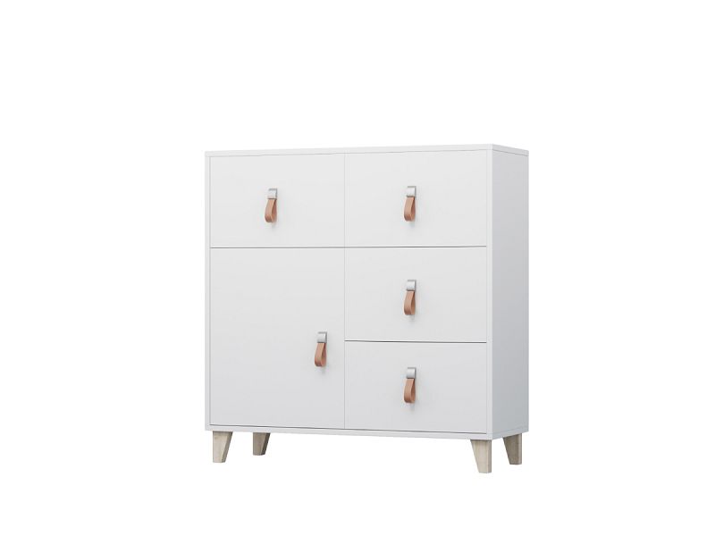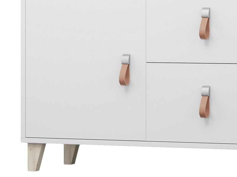 Komoda Felicita je ukotvena na dřevěných nožkách ve vzduchu. Díky tomu je možné pod nábytkem snadno uklidit.