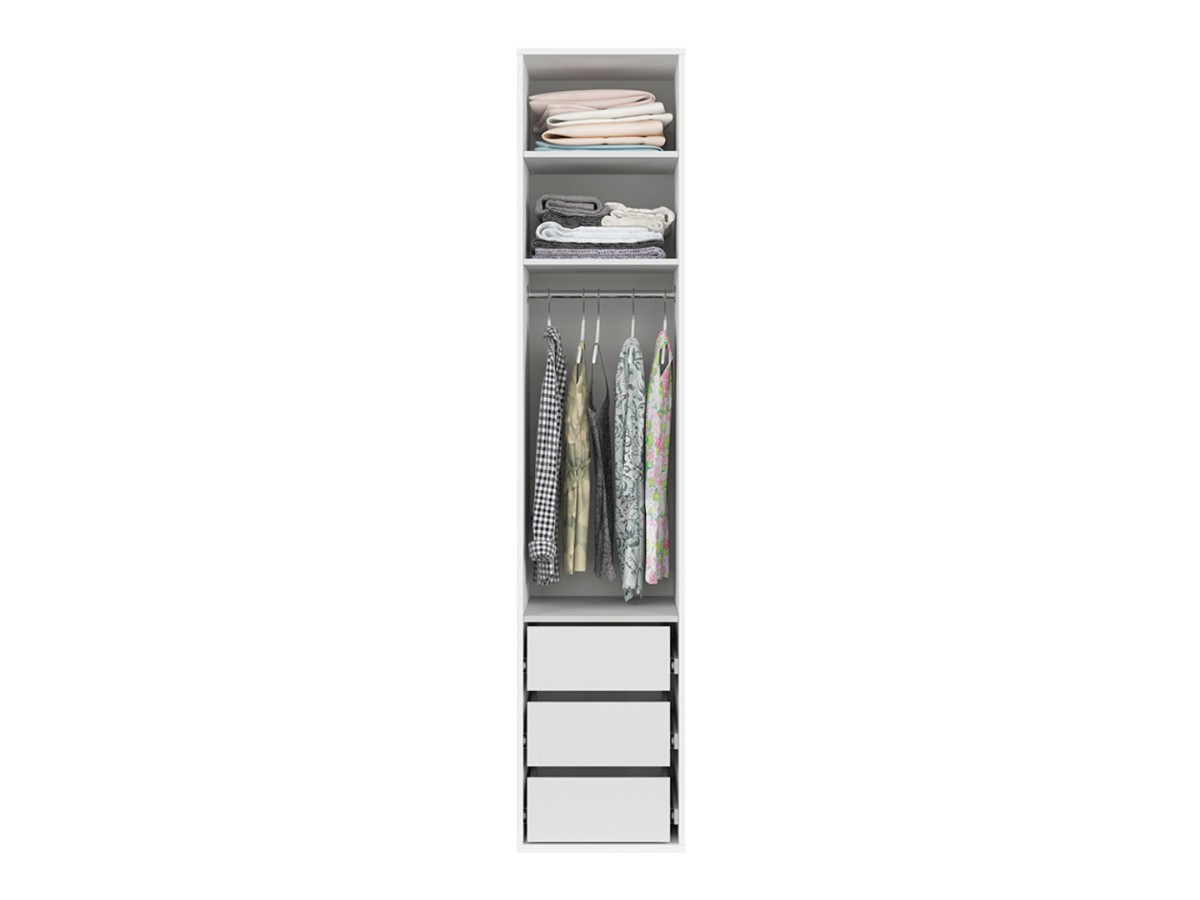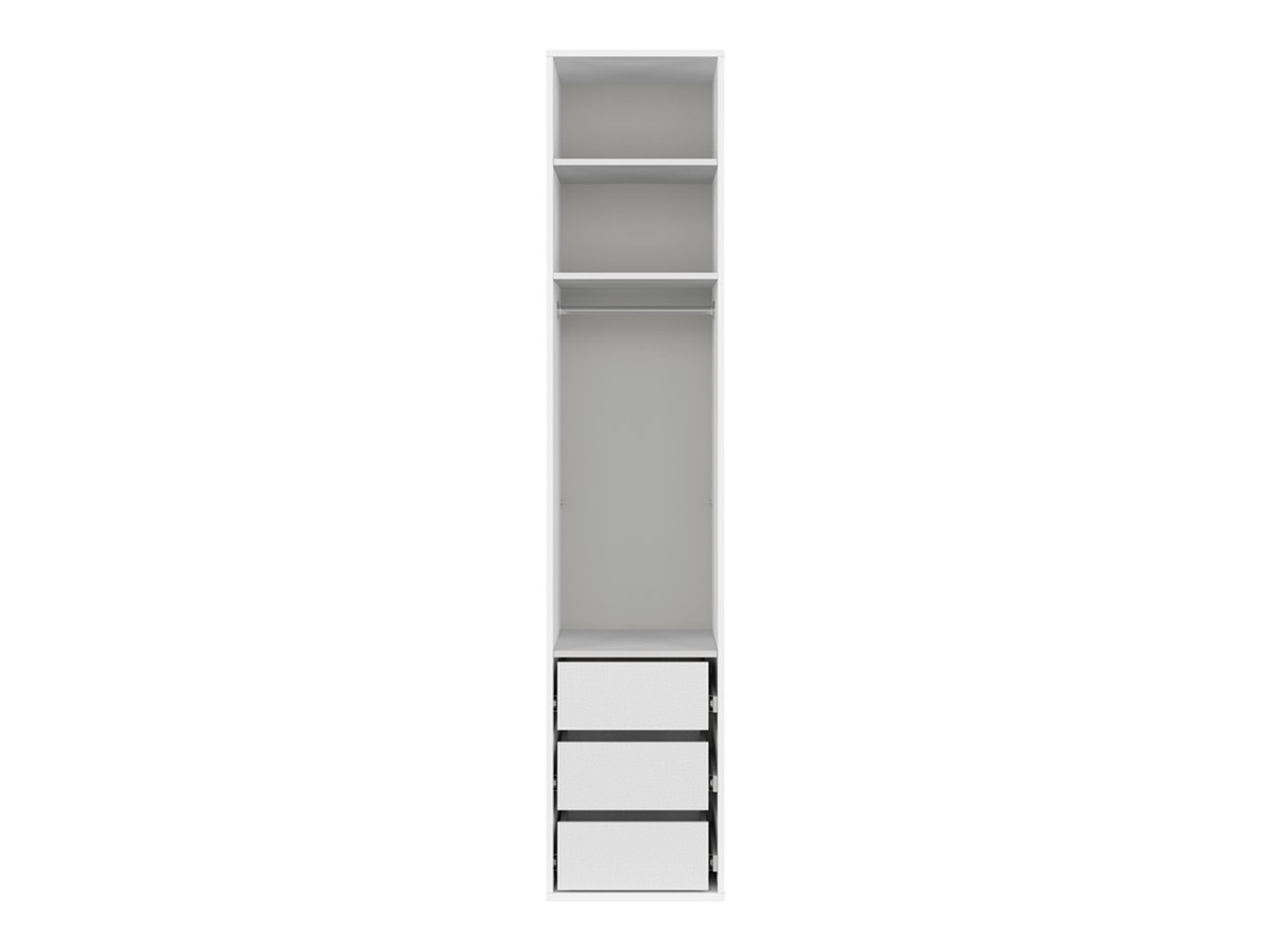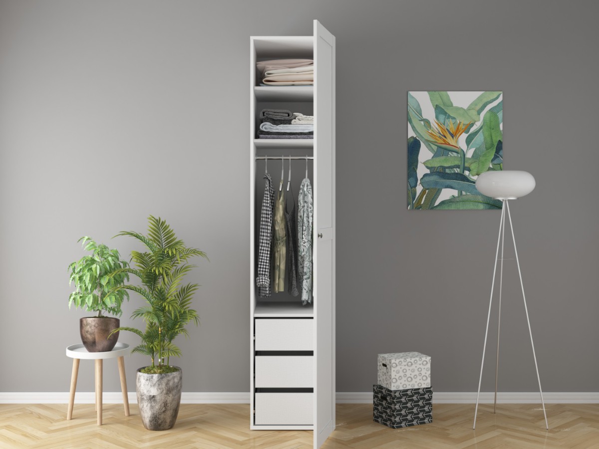 Barevné provedení skříně je v bílém tónu. Materiál lamino, které se snadno udržuje. Bílá barva zajistí čistý a moderní svěží vzhled. Opticky zvětší a projasní místnost. Šatní skříň FLEX má k dispozici police, šatní tyč a zásuvky ve spodní části. Zásuvky mají plný výsun s kuličkovými pojezdy, díky čemuž se do ni snadněji dostanete.