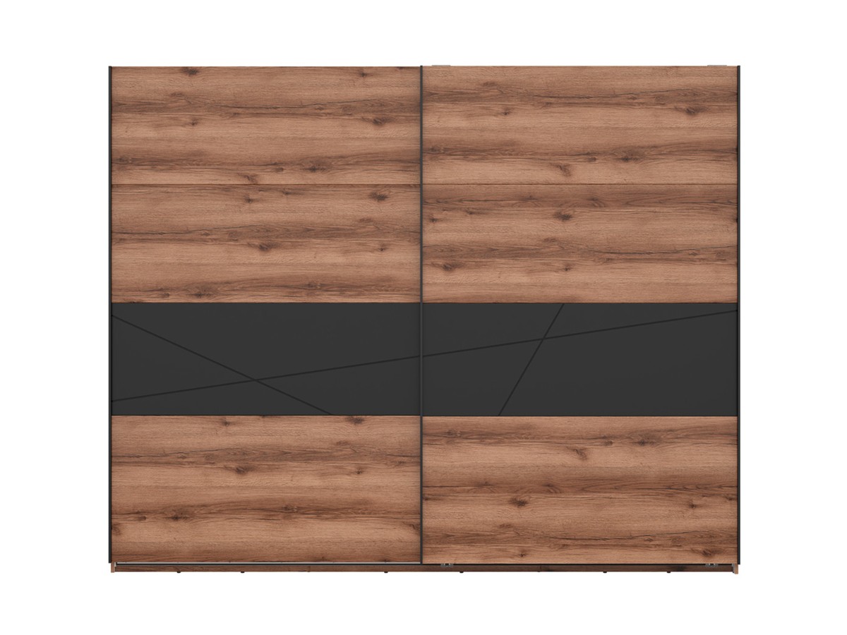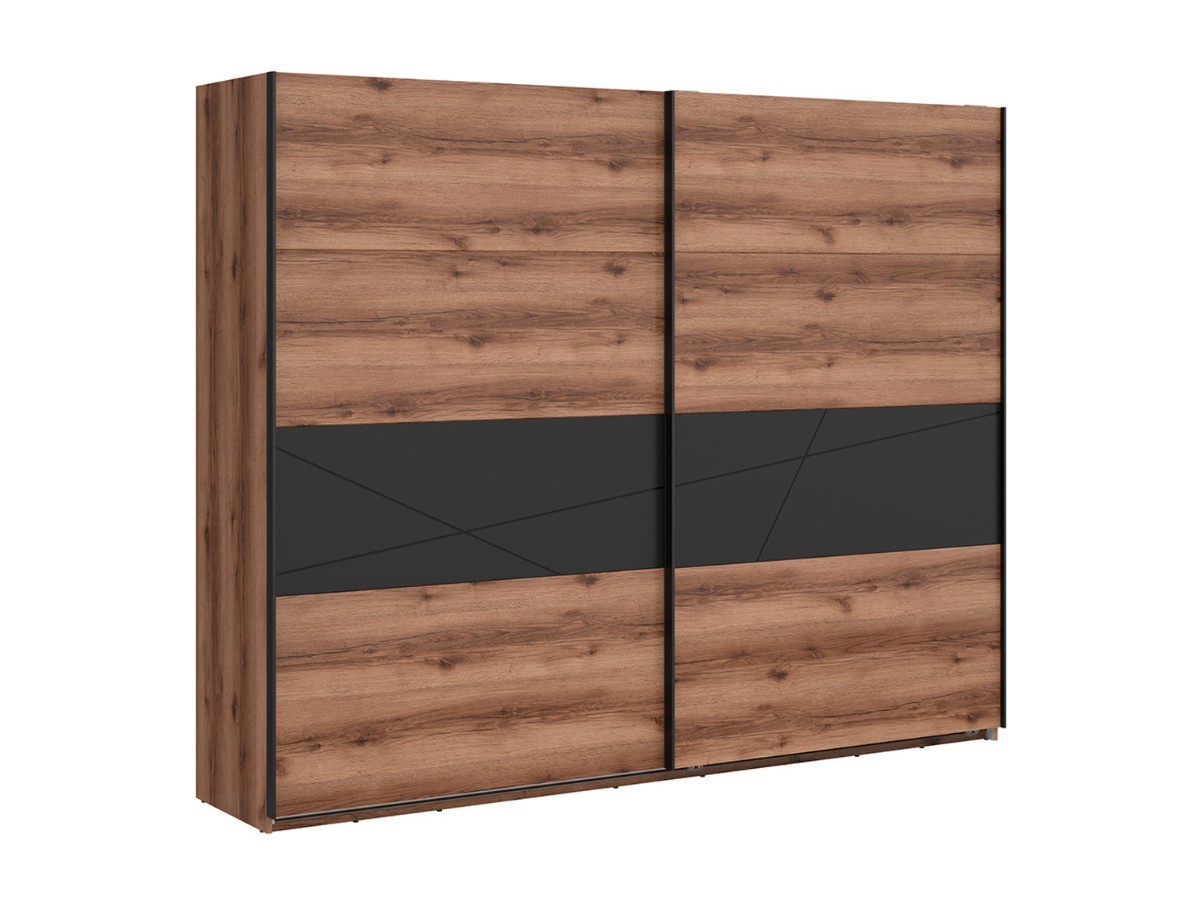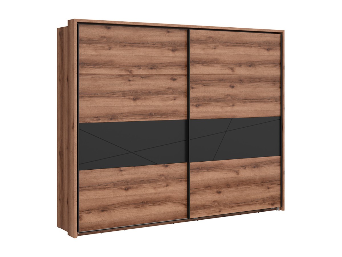 Šatní skříň FORN je vyrobena z lamina v barevném provedení - dub delano tmavý/černý mat. Dvířka jsou z MDF potaženy PVC fólií a mající stylové frézované vzory. Její úložný prostor je v podobě šatních tyčí a polic. Komfortní používání skříně FORN zajišťují panty s tichým dovíráním. Dvířka jsou posuvné.
