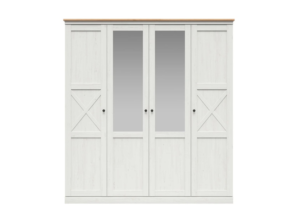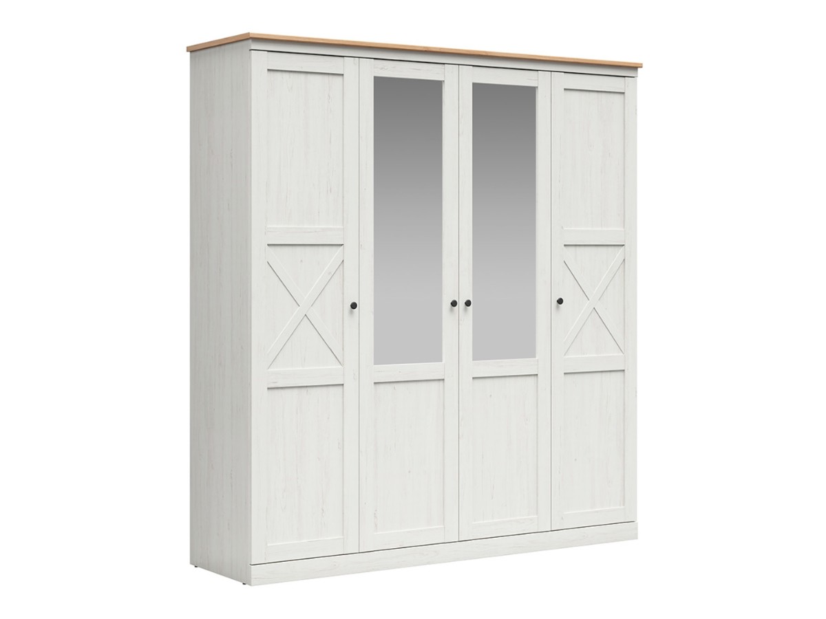 Tato šatní skříň má celkem 4 dvířka, z nichž dvoje jsou vybaveny zrcadly. Zrcadla vám umožní rychlou kontrolu vašeho vzhledu a jsou praktickým doplňkem při oblékání. Nechybí kovové černé úchytky v knoflíkovém provedení.