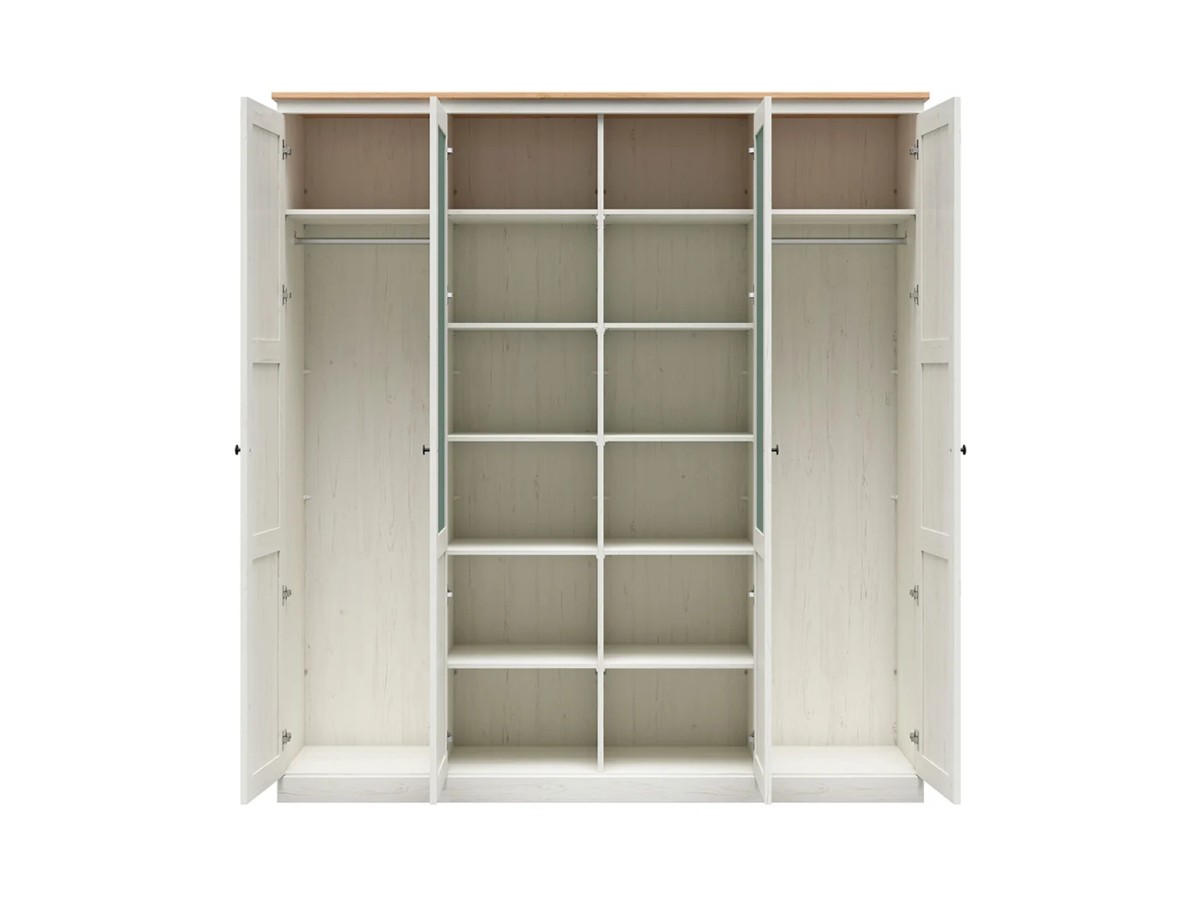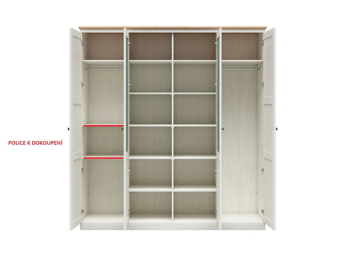 Vnitřek skříně je vybaven dostatečným množstvím polic a šatní tyčí pro uspořádání vašeho oblečení. Můžete si snadno přizpůsobit uspořádání skříně dle svých potřeb. Pokud budete potřebovat další police, je možné je dokoupit zvlášť a přidat je podle vašich preferencí.