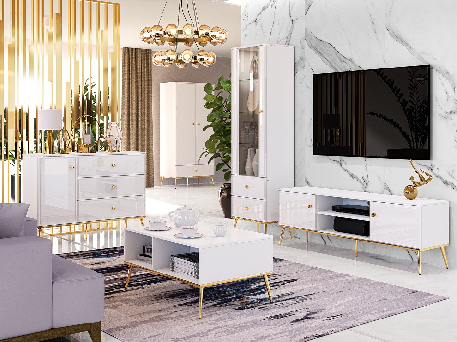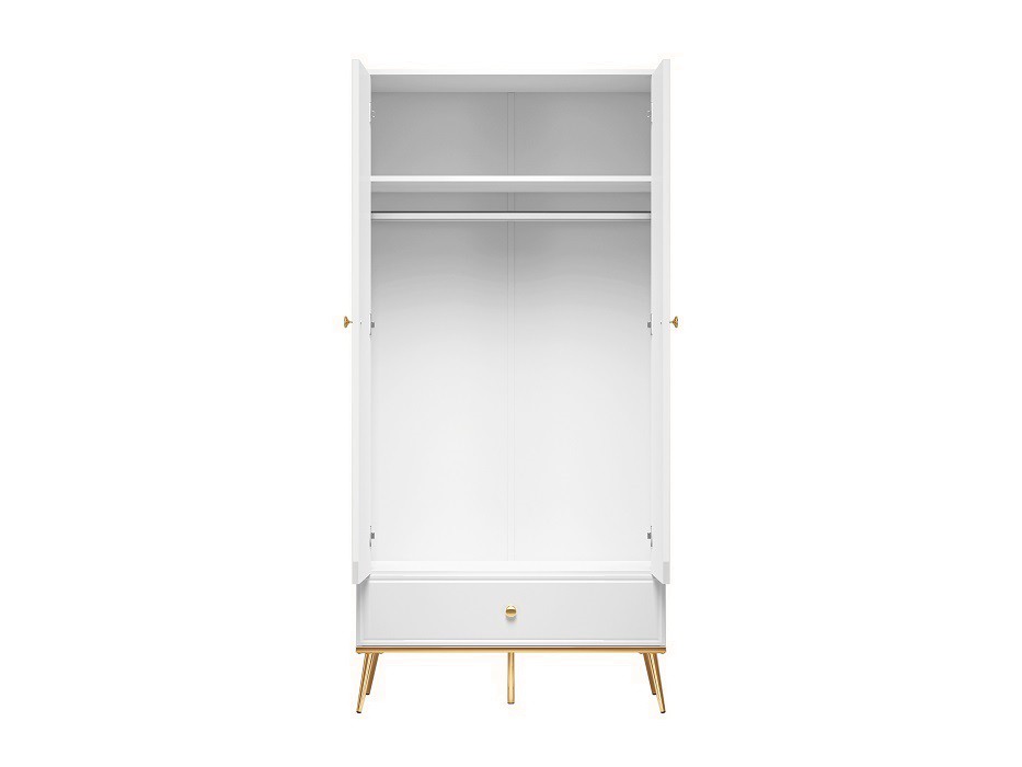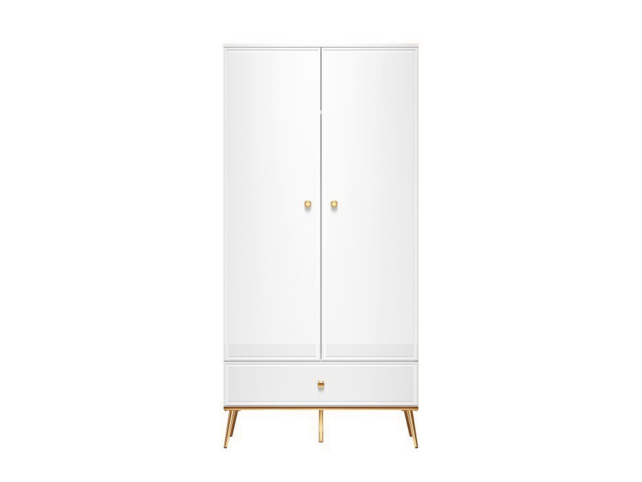 Skříň Goldie 01 bude ozdobou vašeho obývacího pokoje, ložnice či předsíně. Lamino v bílém matu a dvířka z MDF v bílém lesku vkusně doplňují vysoké kovové nožky ve zlatém dekoru. Tato kombinace evokuje nádech luxusu a útulnosti.