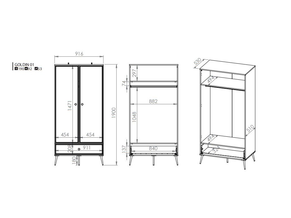 Vnitřní vybavení skříně tvoří šatní tyč, jedna horní police a také nepostradatelná spodní zásuvka. Jistě oceníte celovýsuv i tiché dovírání zásuvky.