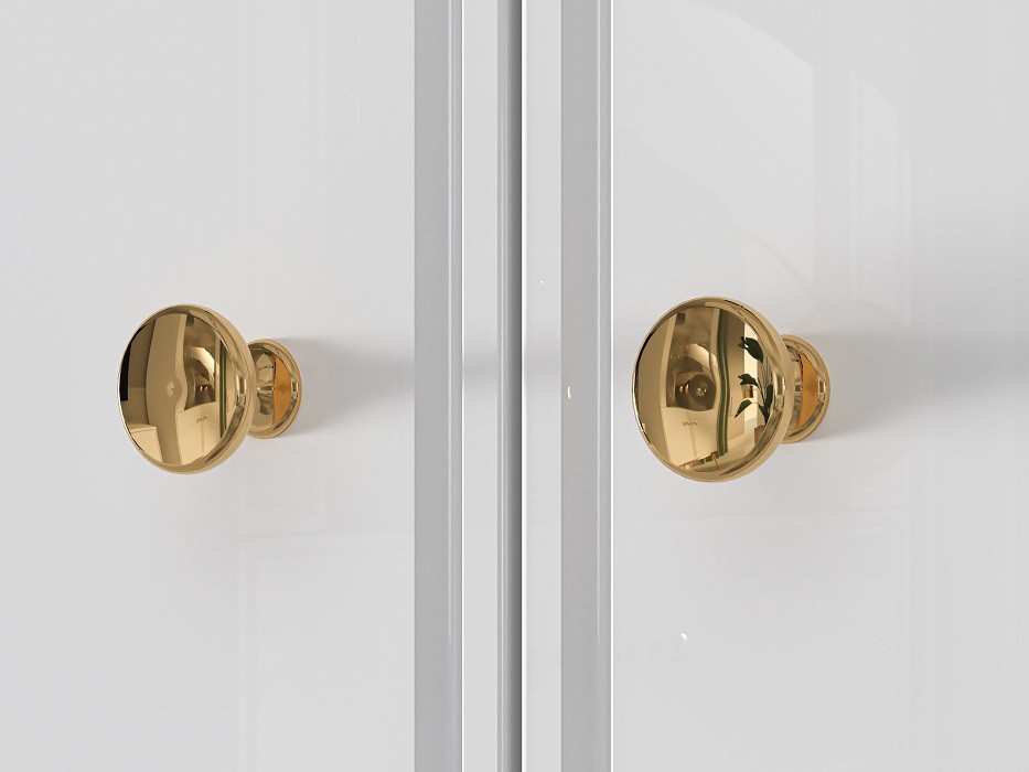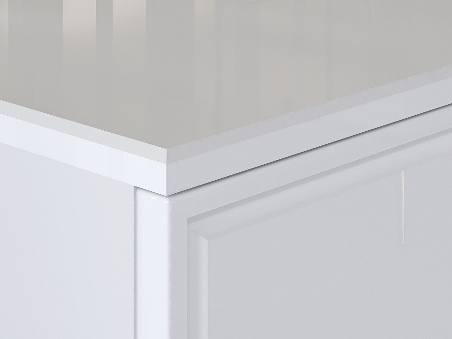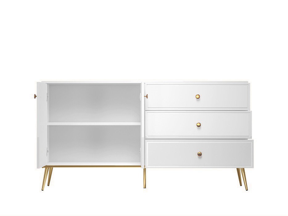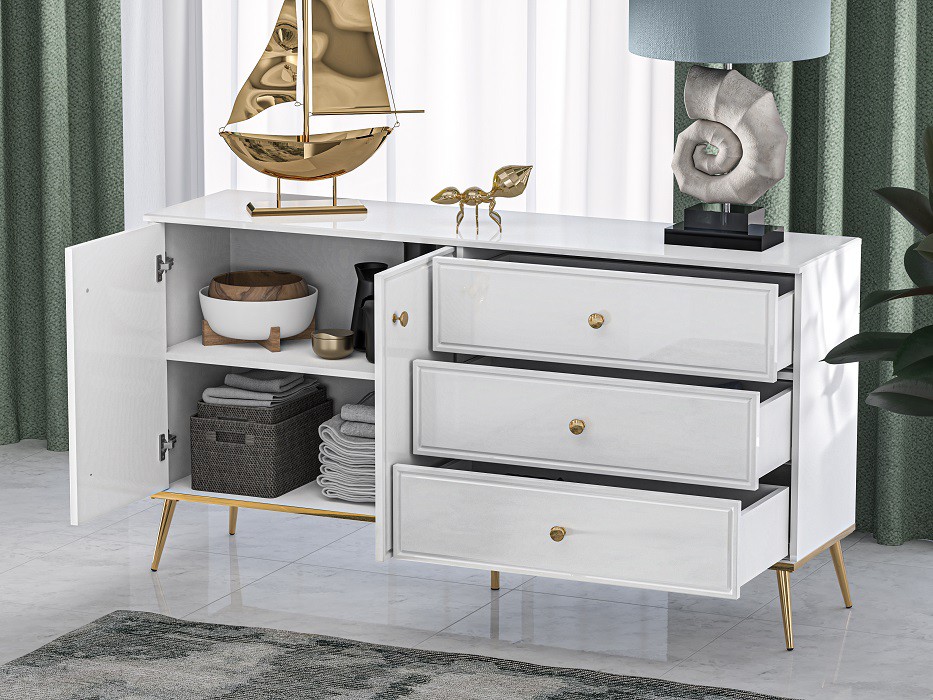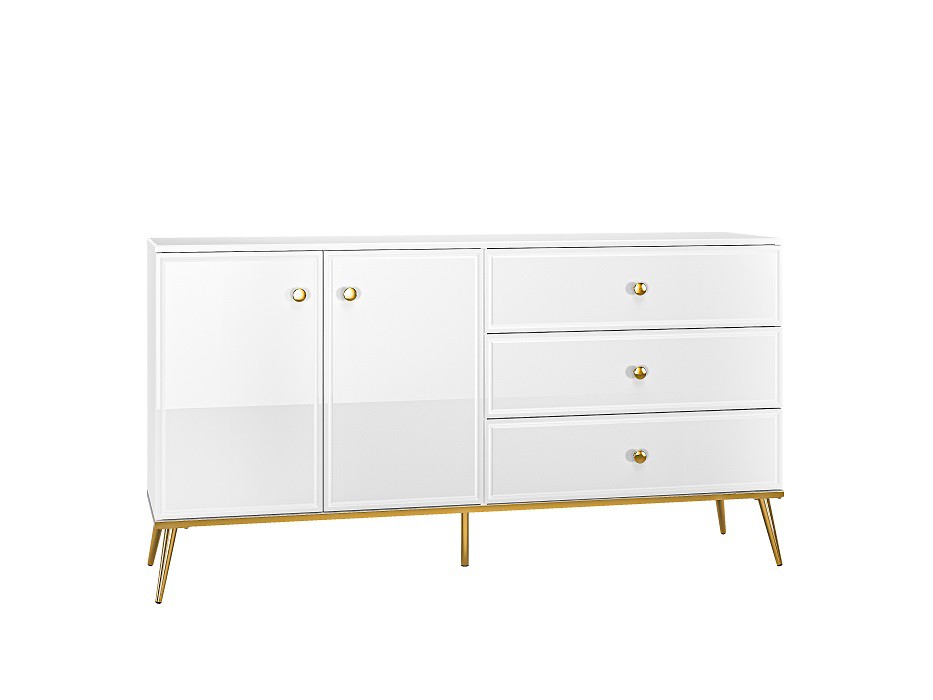 Základem komody je lamino v dekoru bílá mat. Dvířka skříňky i čela zásuvek jsou vyrobena z MDF desky v bílém lesku s ozdobným frézováním. Hrany ABS. Lesk podporují také decentní kovové úchytky ve zlatém tónu.
