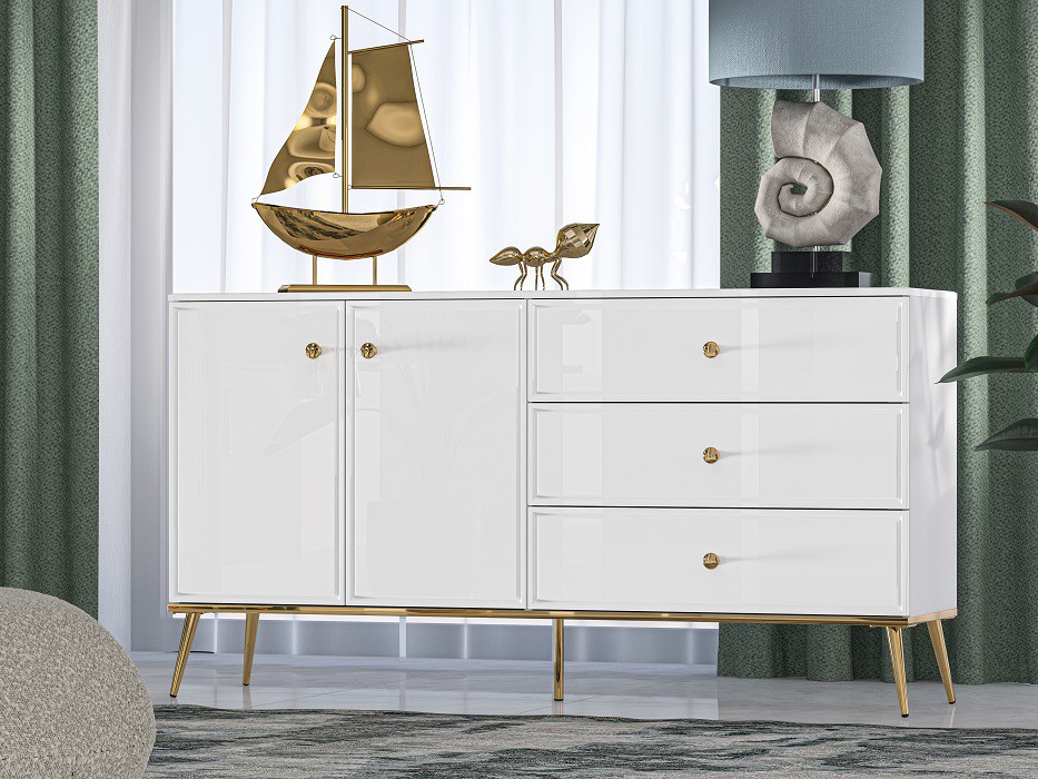Komoda Goldie 04 rozhodně nepatří mezi klasické, stylově nezajímavé komody. Díky svému nadčasovému designu, kombinaci bílého lesku a ještě lesklejšího zlata, působí komoda moderně, zajímavě a vkusně.