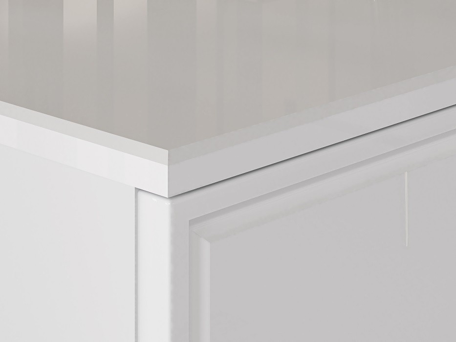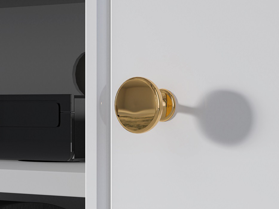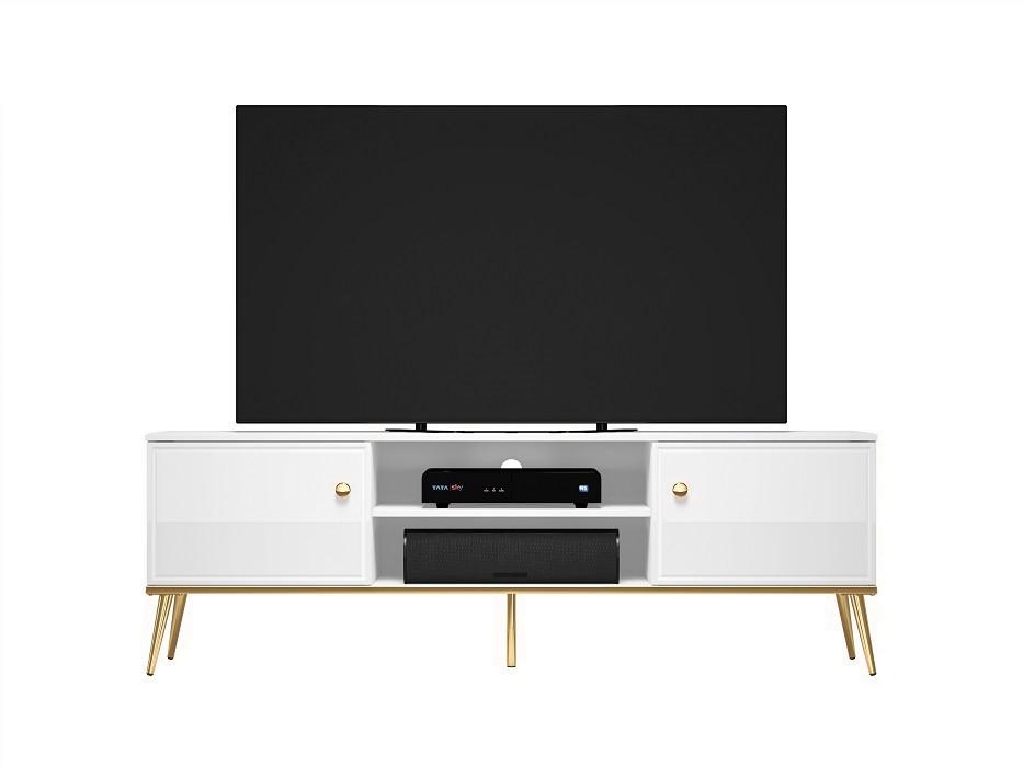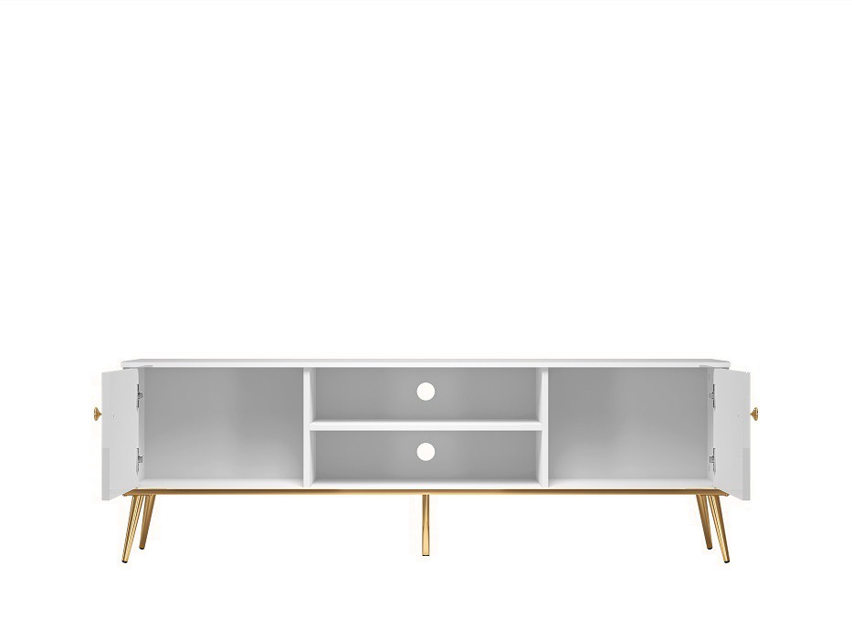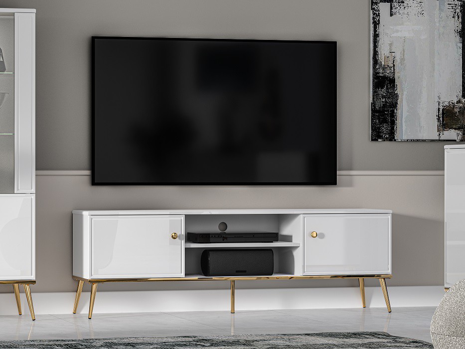 Televizní stolek je vyroben v kombinaci bílého matného lamina a MDF desek v bílém lesku - dvířka stolku. Kontrastním, ale přesto skvěle ladícím doplňkem jsou kovové nohy ve zlatém dekoru. Hrany ABS.