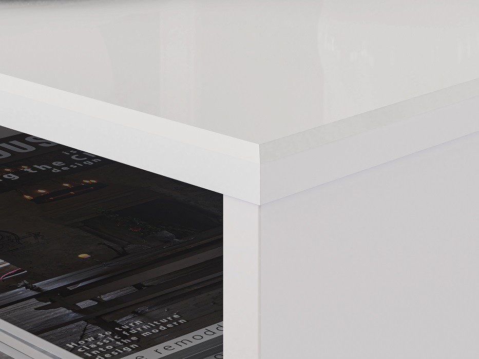 Na výrobu stolku je použito bílé lamino v matném provedení v kombinaci s MDF deskou v bílém lesku. Pro zajištění větší odolnosti při užívání jsou hrany stolku opatřeny ABS. Pěkným prvkem jsou také ozdobné zkosené hrany stolku.