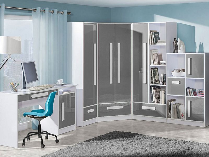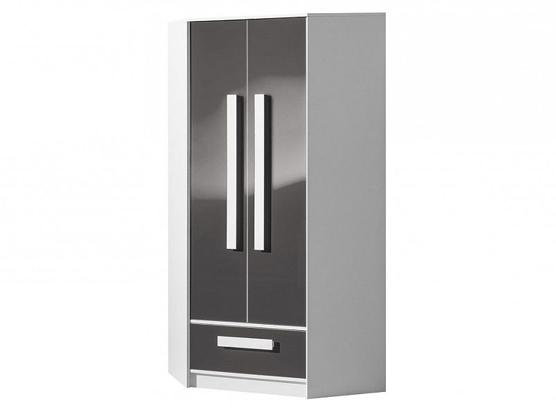 Dvířka skříně mají praktickou šedou barvu, korpus a úchyty jsou vyrobeny v bílém barevném provedení.