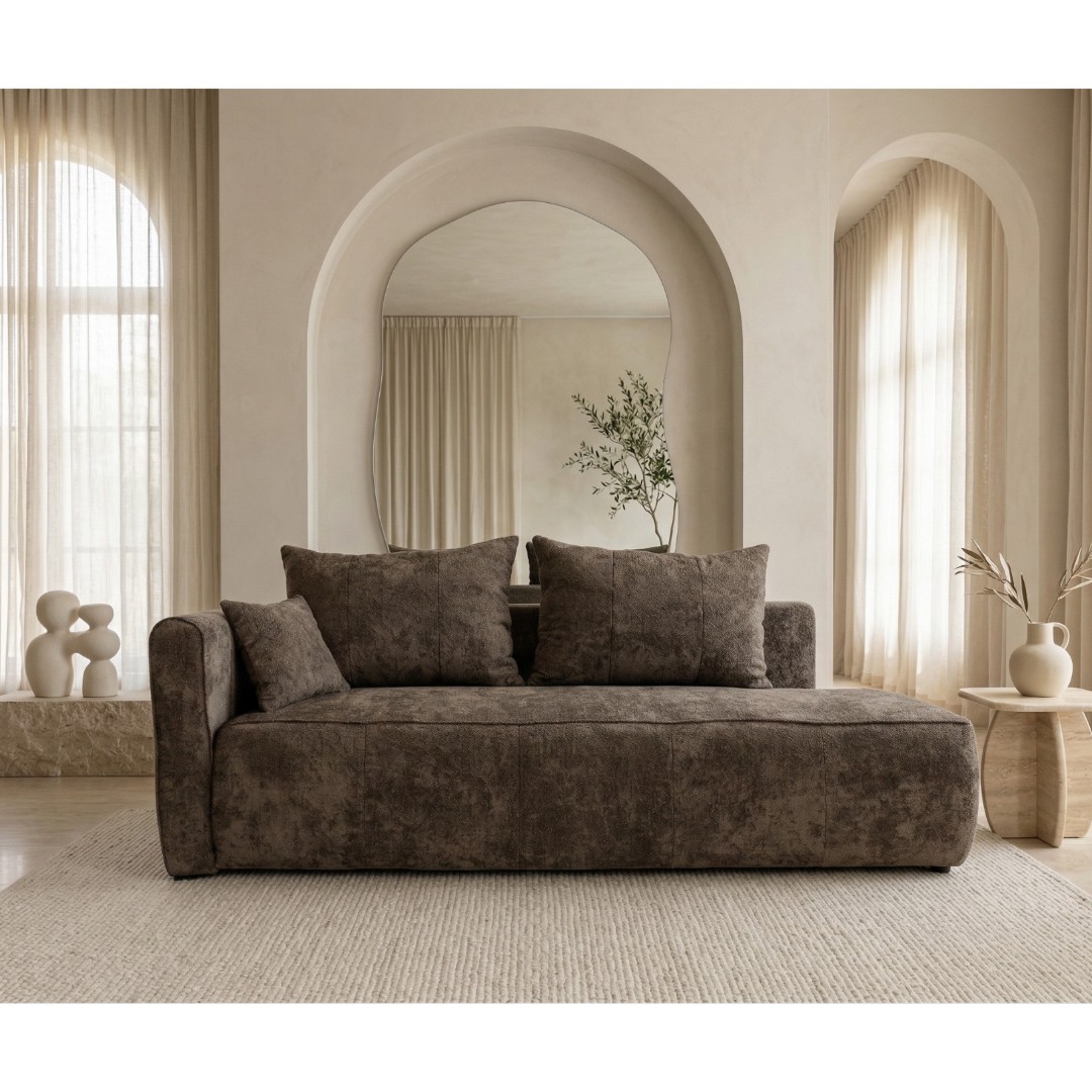 Pohovka je potažena látkou Kiara 855 - potah v hnědém odstínu disponuje jemnou texturou, která je velmi příjemná na dotek a dodává pohovce hloubku. Tato látka se skvěle kombinuje s přírodními materiály jako dřevo či kov. Hluboký sedák 57/84 cm a opěrné polštáře vás doslova vybízejí k relaxaci po náročném dni. Hosté u vás mohou zůstat i přes noc. Během chvilky proměníte stylovou pohovku v prostorné lůžko pro příležitostné přespání. Velikost spací plochy je o rozměru 146 x 190 cm.