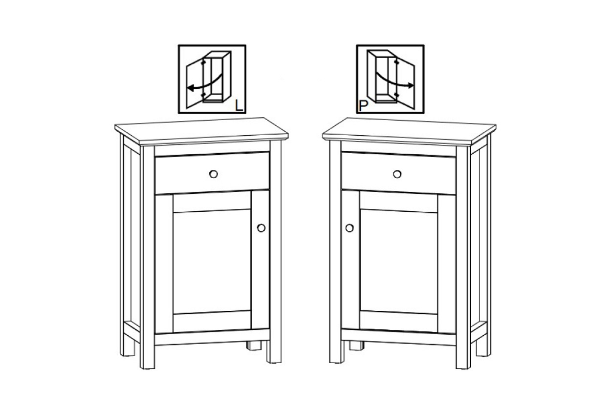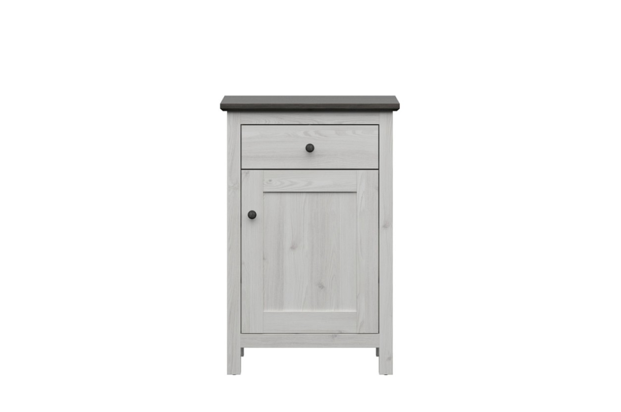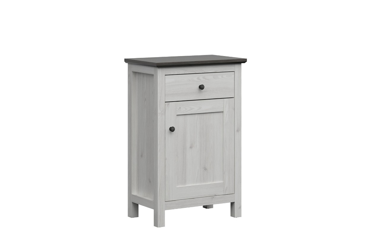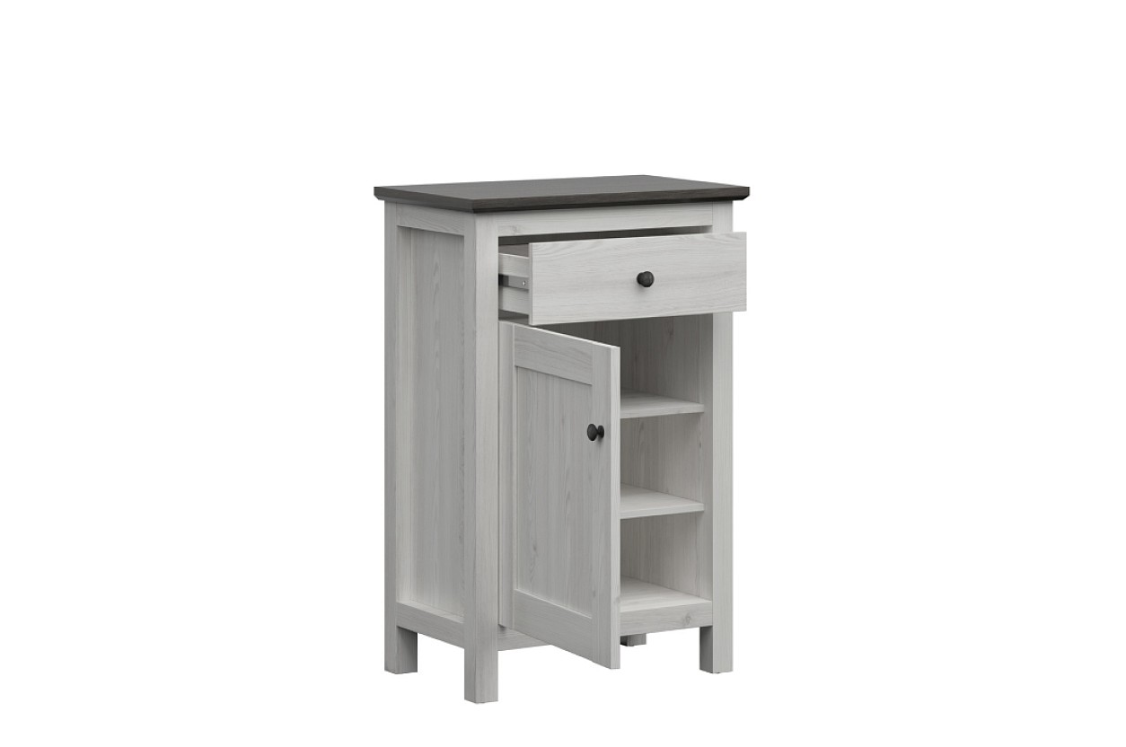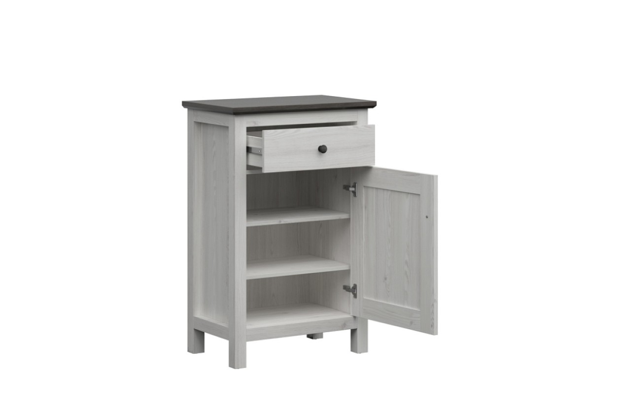Komoda HESEN propojuje tón borovice larico se světlým odstínem modřin sibiu světlý, což vytváří harmonický kontrast. Úložný prostor je v podobě zásuvky a polic uschovaných za dvířky. Dvířka je možné před první montáží upevnit s otevíráním vlevo/vpravo. Úchytky jsou vyrobeny z kovu, což dodává komodě elegantní vzhled. Součástí je tiché dovírání dvířek a plynulý dojezd šuplíku.