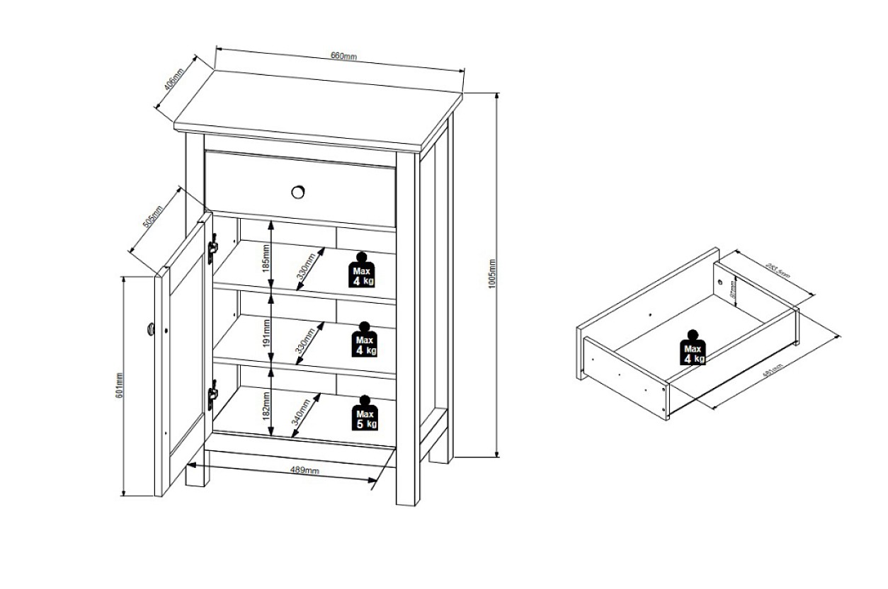 Zásuvka má rozměry 46,1 x 9,7 x 28,3 cm a maximální nosnost 4 kg. Síla dvířek je 19 mm, nožky mají sílu 50 mm.