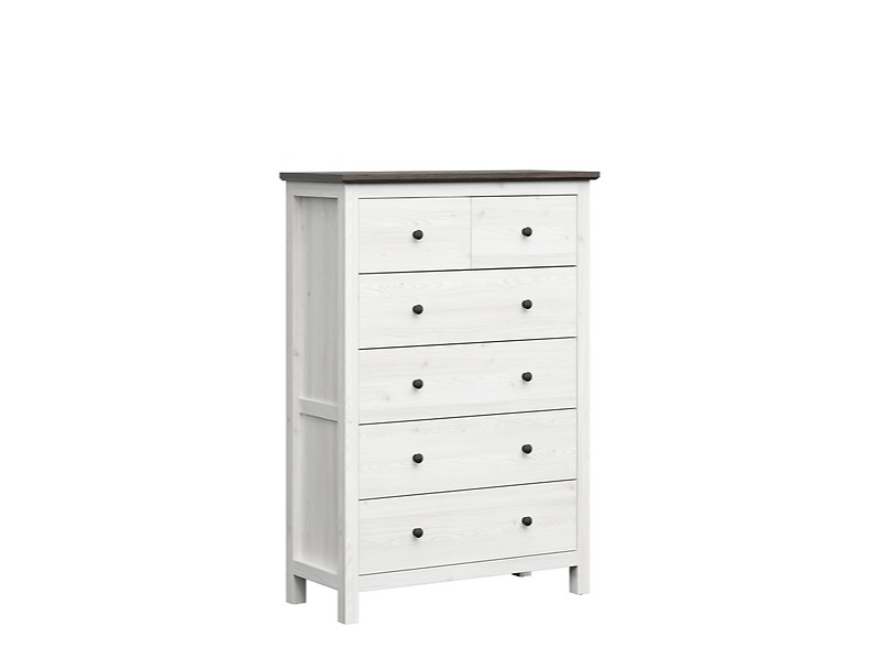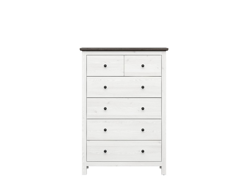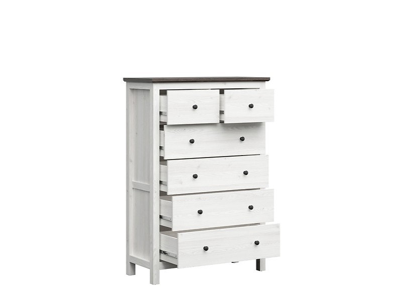 Komoda HESEN je vyrobena z lamina v kombinaci barev modřín sibiu světlý/borovice larico. Ozdobená je dekoračními lištami v boční části. Zásuvky s plným výsuvem jsou opatřeny kovovými úchyty tmavé barvy.