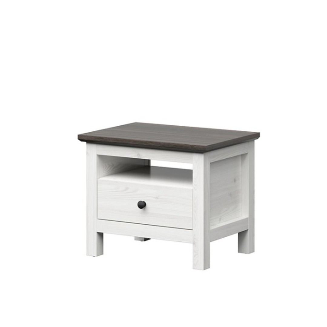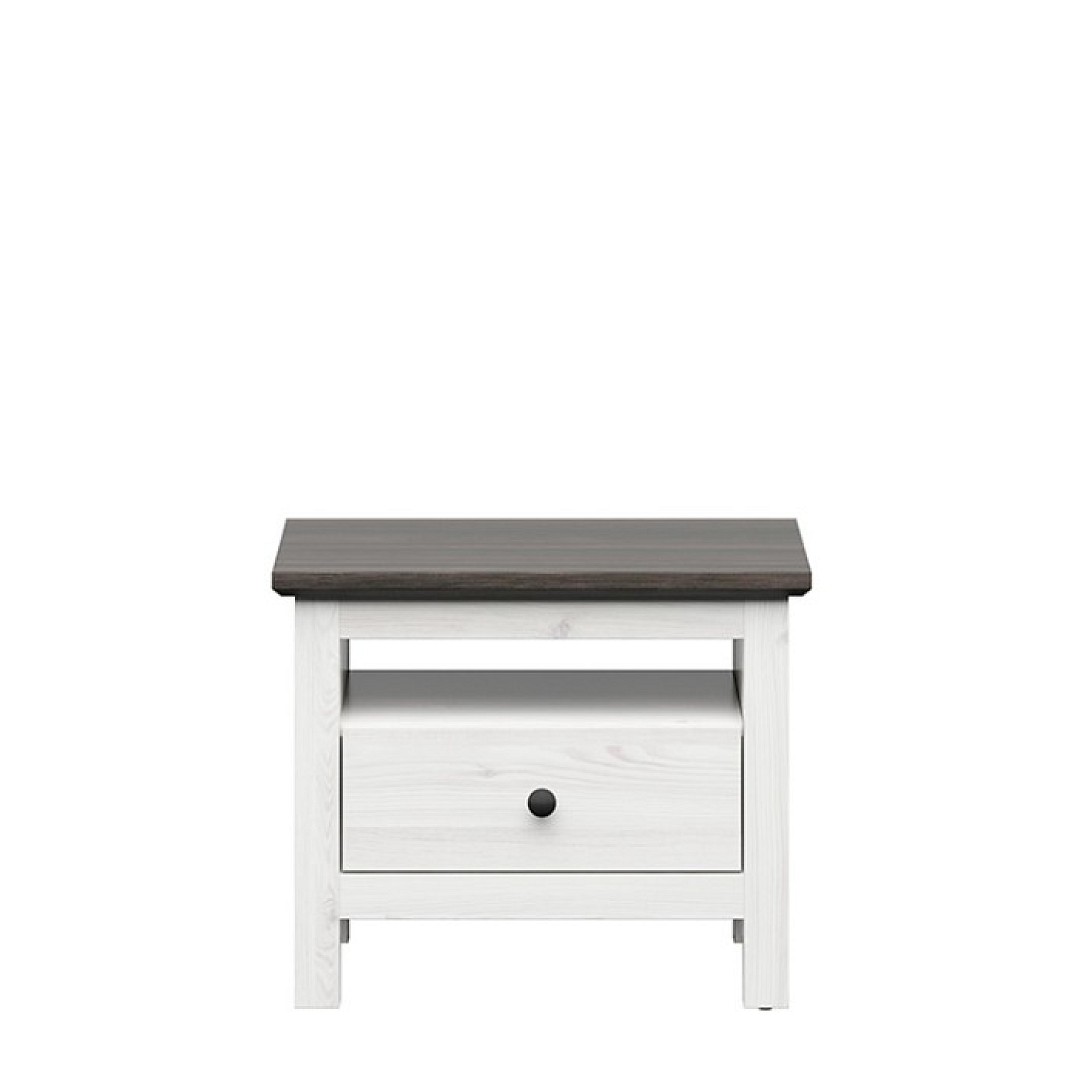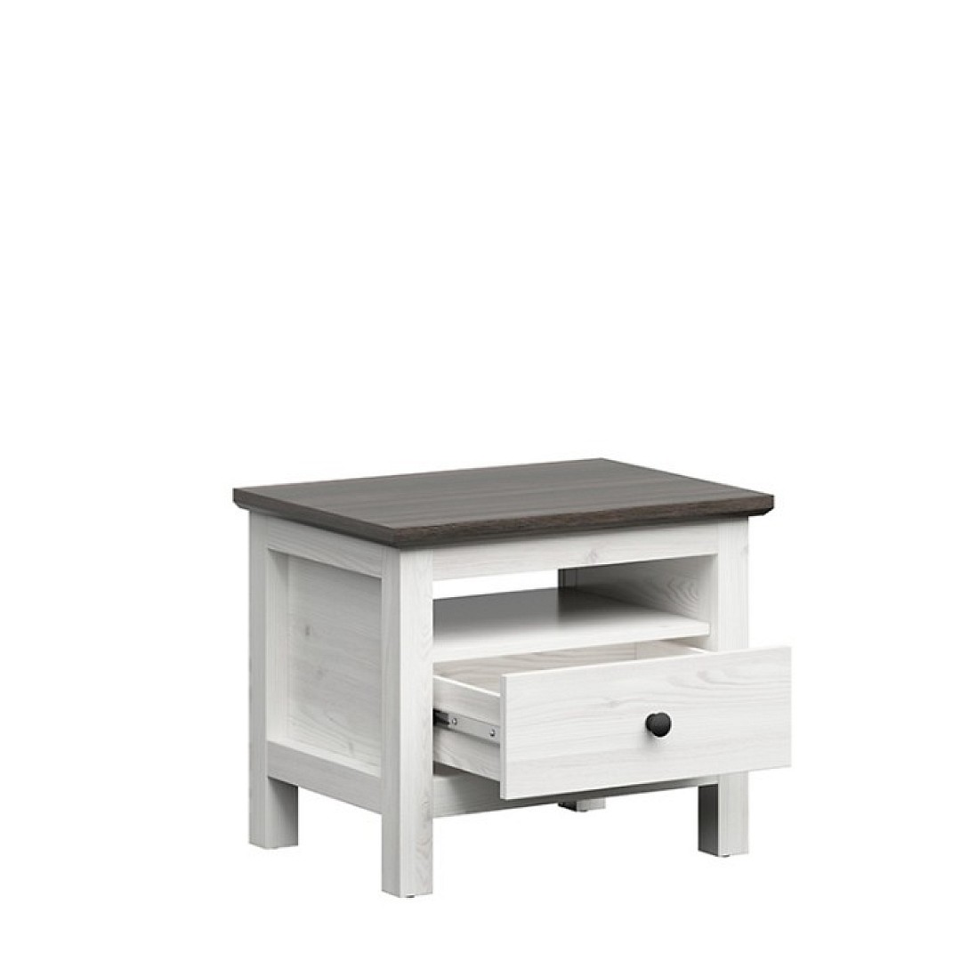 Součástí je jeden šuplík a otevřená police. Na vrchní desku můžete umístit noční lampu, budík a další věci. Zásuvka je opatřena tichým dojezdem. Úchytka je v podobě kovového knoflíku tmavé barvy. Vnitřní rozměr šuplíku je 40 x 11 x 35 cm.