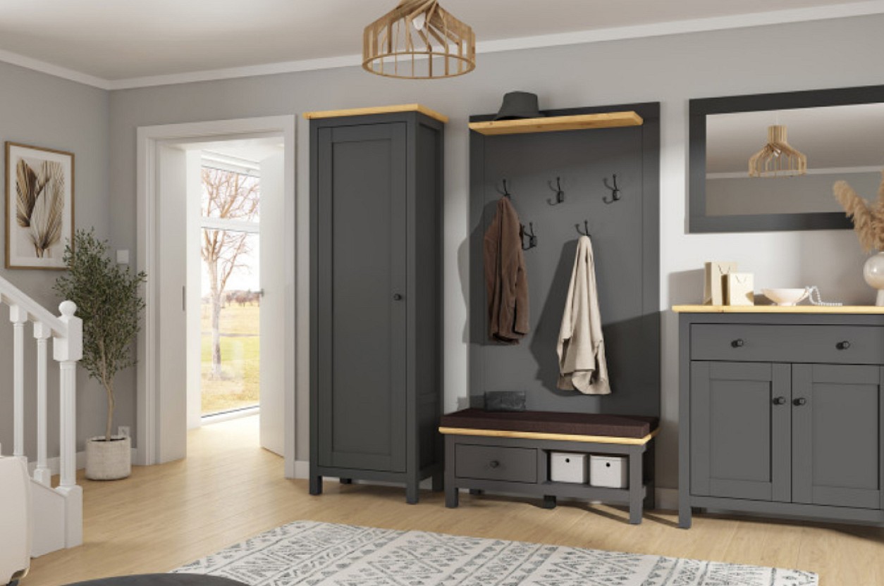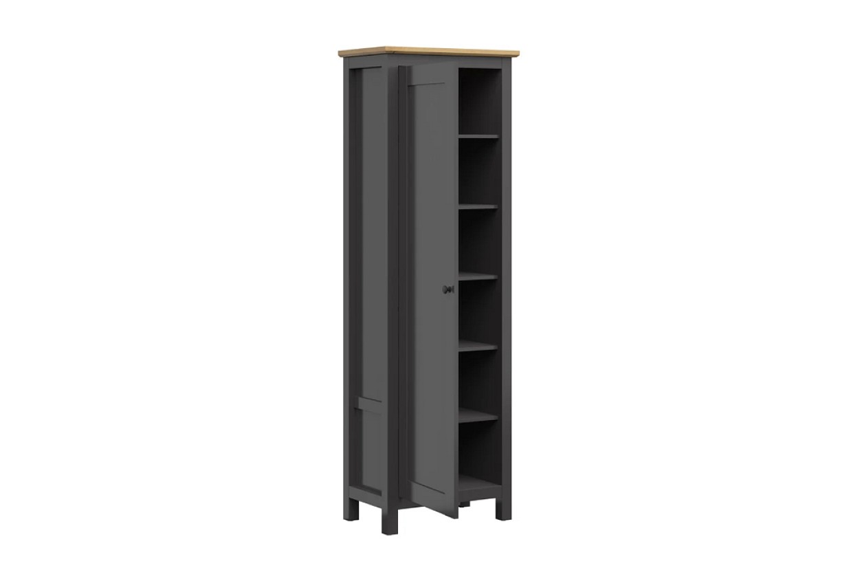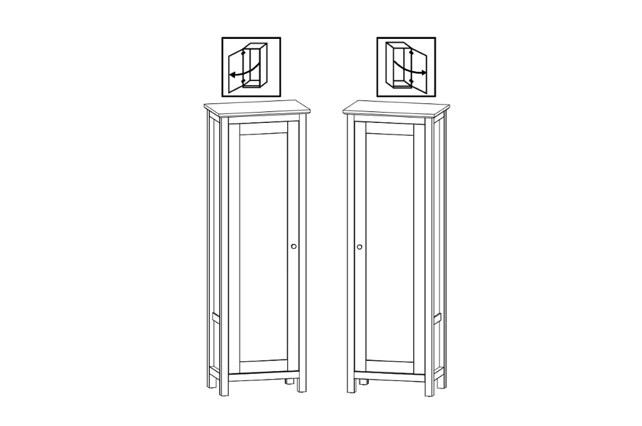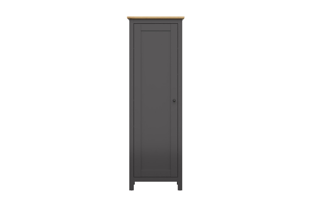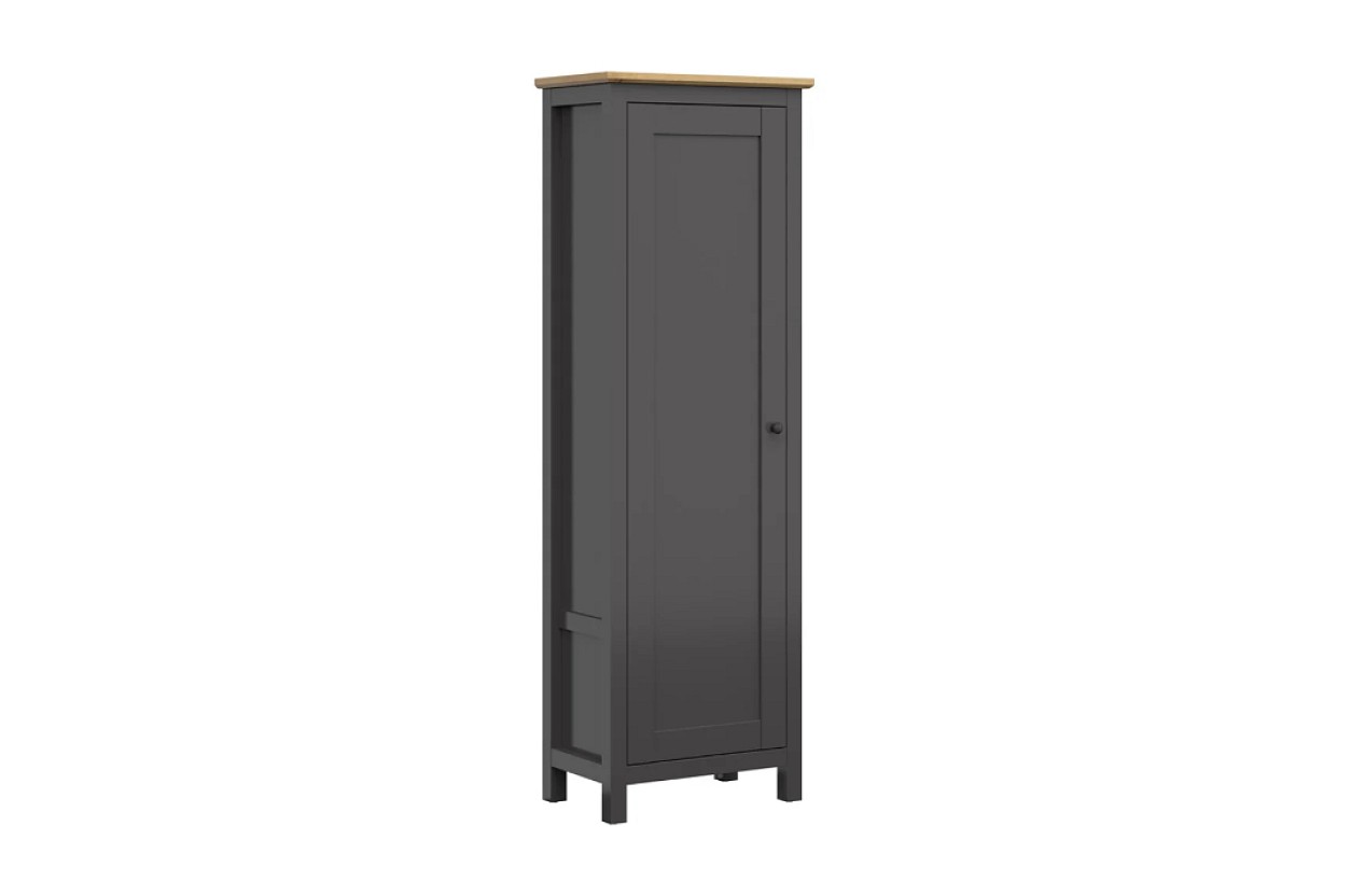 Vyrobená je z lamina v kombinaci tonů grafit/dub artisan. Nabízí policový úložný prostor vhodný k uložení oděvu, ale také bot. Dvířka mají kovový úchyt a před první montáží je možné vybrat si, zda bude skříň s otevíráním vlevo/vpravo.