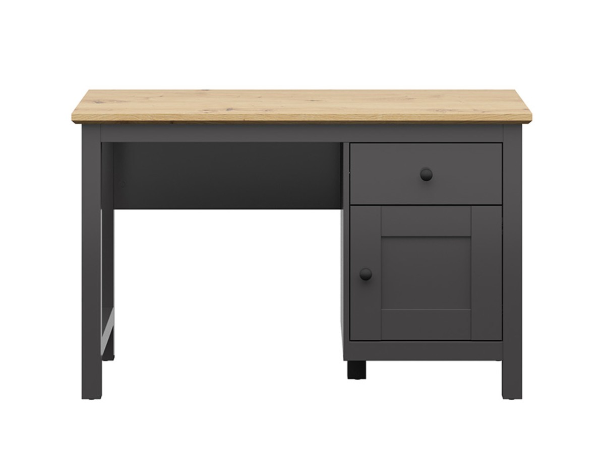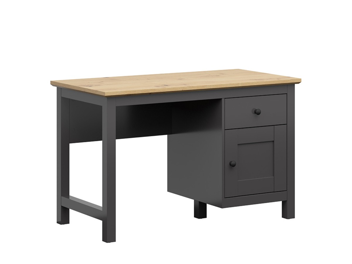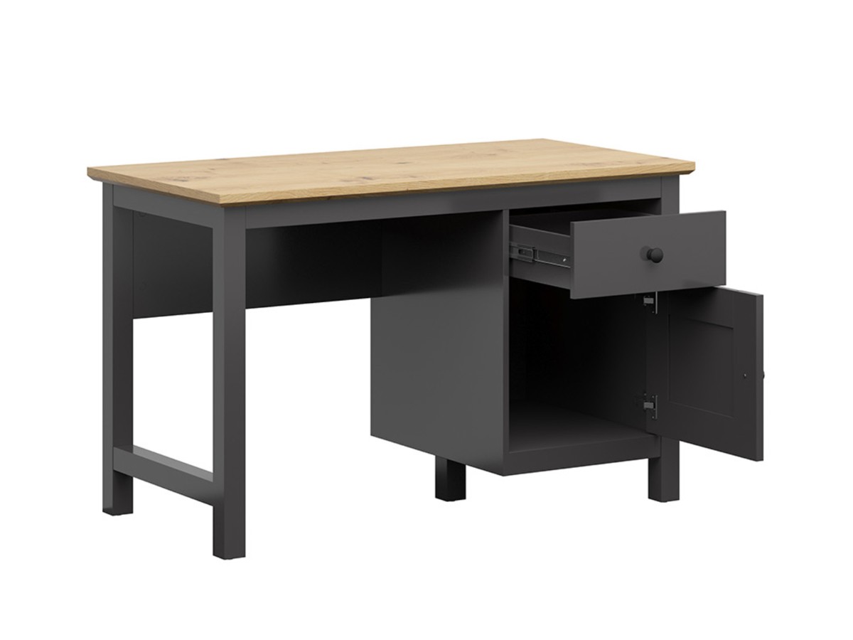 Nábytek byl vyroben z lamina v kombinaci barev grafit/dub artisan. Součástí je systém tichého a plynulého dovírání dvířek. Úložný prostor je v podobě zásuvky a skříňky v noze stolu. Vnitřní rozměr šuplíku je 35 x 9 x 40 cm. Prostor pro židli je 63,4 cm. Síla vrchní desky je 28 mm.