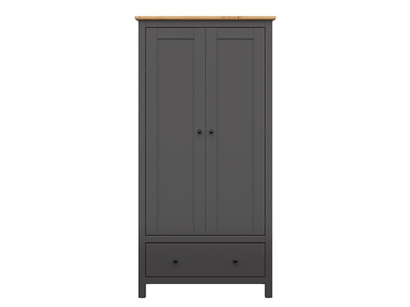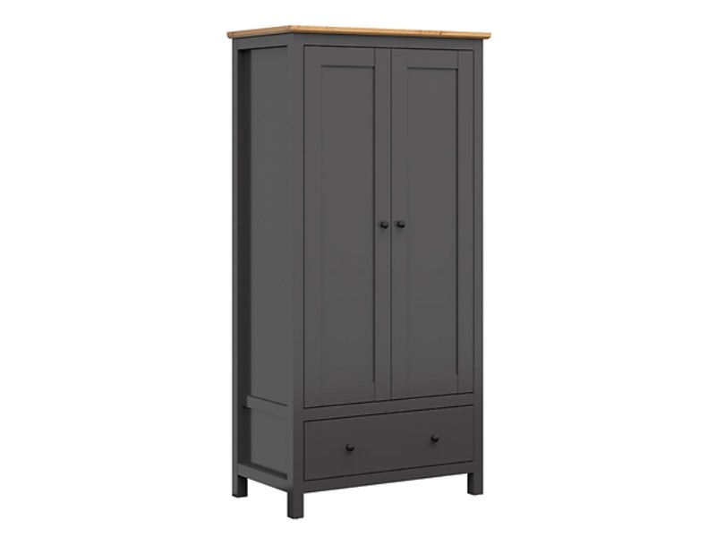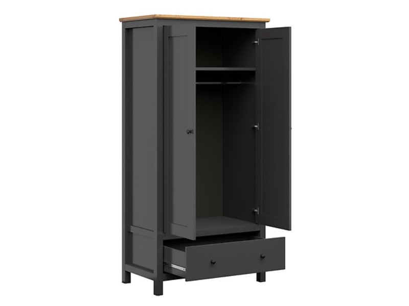 Šatní skříň HESEN je v barevném provedení grafit/dub artisan a to z lamina. Za dvířky je ukrytá šatní tyč, vhodná k zavěšení košil, bund a jiných módních outfitů a jedna vrchní police. Ve spodní části se nachází zásuvka pro uschování drobností. Součástí jsou kovové úchytky ve tvaru knoflíku + systém tichého dovírání. Možné dokoupit dělící policový kříž zvlášť viz související zboží.