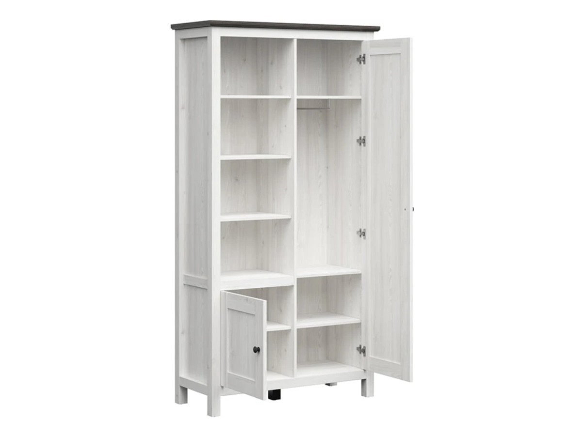 Skříň HESEN je v barevném provedení modřín sibiu světlý/borovice larico a to z lamina. Za dvířky jsou ukryté police 15mm a šatní tyč. Toto rozvržení zajistí snadný přehled v ukládaných věcech. Police mají délku 44 cm. Šatní tyč je upevněna, není možné ji vysunout do prostoru.
