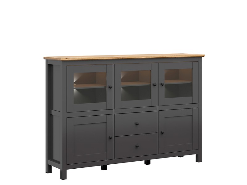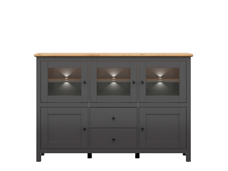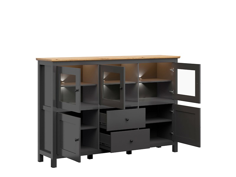 Barevné provedení vitríny HESEN je v kombinaci barev grafit/dub artisan. Vyrobena je z kvalitního lamina. Její úložný prostor je v podobě polic a zásuvek. Vše doplněno o knoflíkové, kovové úchytky usnadňující manipulaci při otevírání. Součástí je také LED osvětlení, pro větší zvýraznění vystavených předmětů. V ceně systém tichého a plynulého dovírání.