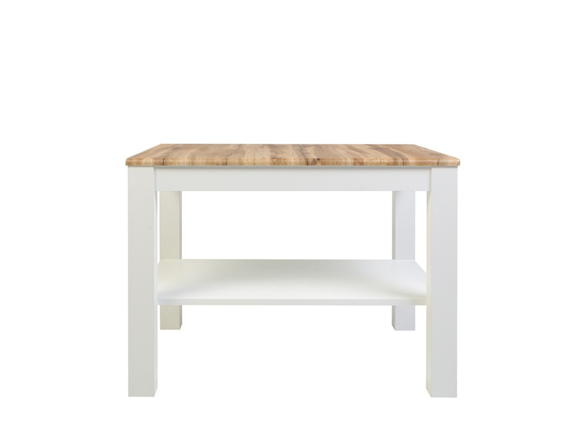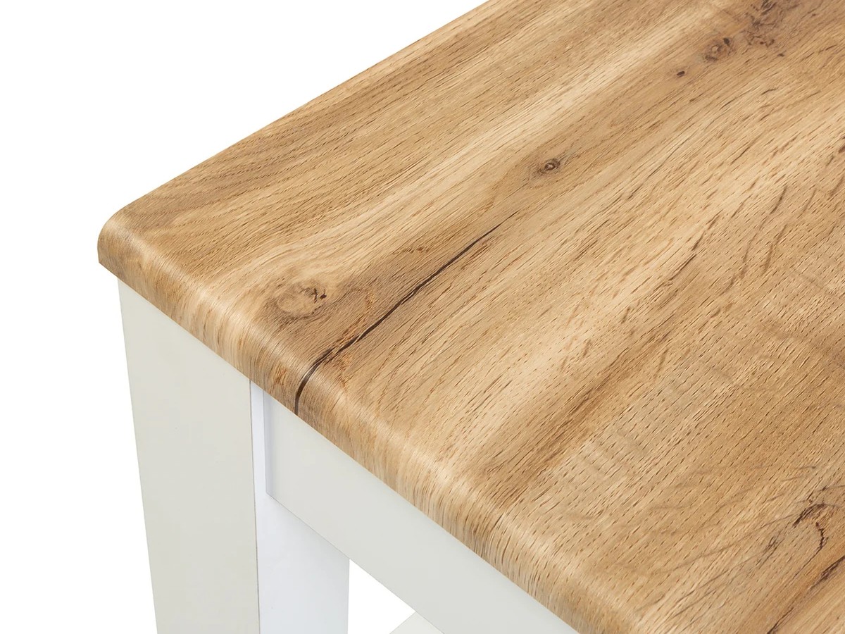 Korpus tohoto konferenčního stolku je proveden v elegantní bílé barvě, která dodává místnosti svěžest a moderní vzhled. Vrchní deska je vyrobena v tónu dubu wotan, což přidává přírodní a teplý prvek do prostoru. Rozměry vrchní desky jsou 50 × 90 cm, což poskytuje dostatek prostoru pro odložení šálku kávy a jiného občerstvení.